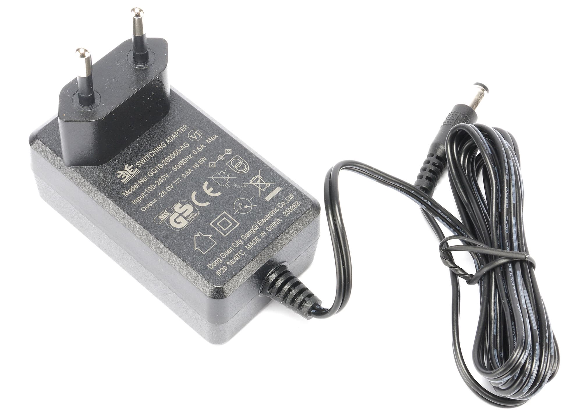 К разъему на задней части зарядной станции присоединяется адаптер питания. Согласно маркировке на корпусе, он обеспечивает устройство постоянным током 28 В, 0,6 А.