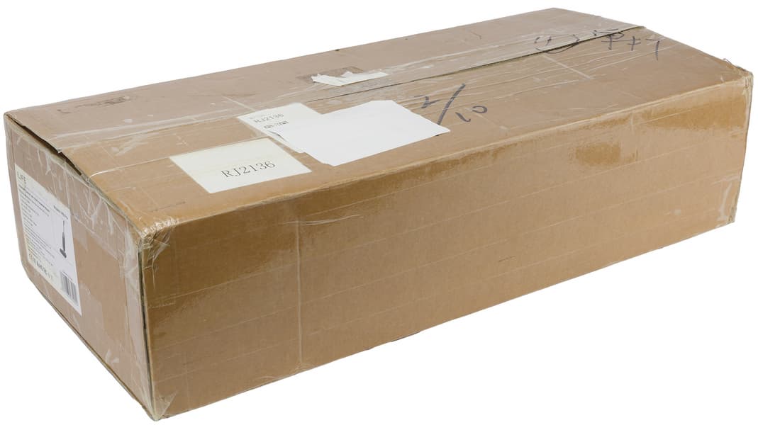 Пылесос поставляется в коричневой картонной коробке без обозначений: упаковка честно указывает на то, что перед нами — бюджетное устройство. На одном из торцов производитель разместил небольшую наклейку с изображением устройства, на которой привел индекс модели, краткие технические характеристики и контактную информацию изготовителя.