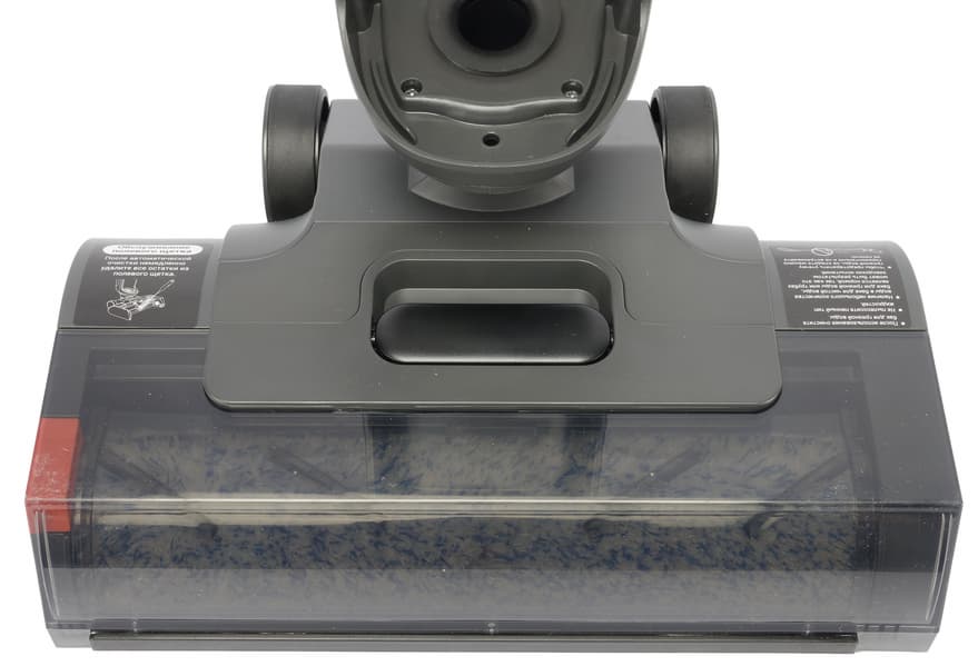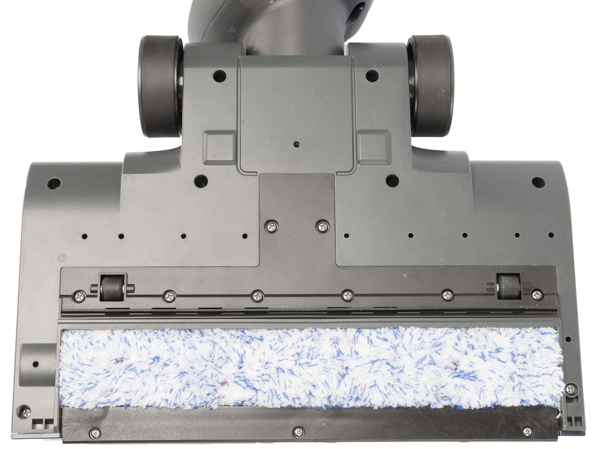 Щетка для уборки пола у этой модели несъемная. Прибор опирается на два обрезиненных колеса, обеспечивающих легкое скольжение по любым поверхностям. Для дополнительной опоры предназначены два резиновых ролика на подошве насадки.