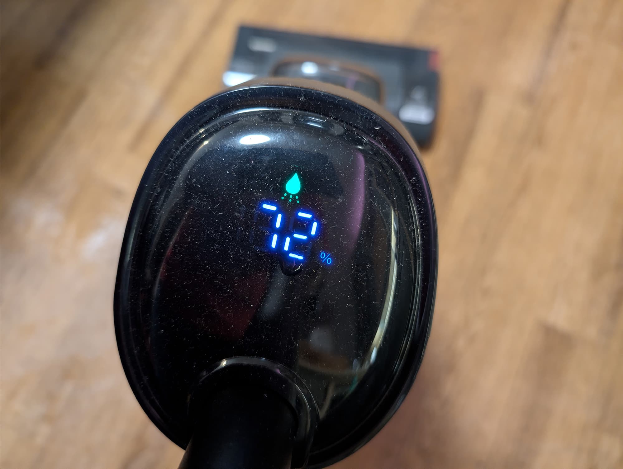 На дисплее включенного пылесоса отображается заряд аккумулятора в процентах. Над большими цифрами при нажатии на клавишу распыления воды зажигается символ капли, а под цифровым дисплеем предусмотрено место для сигнала неполадки батареи.