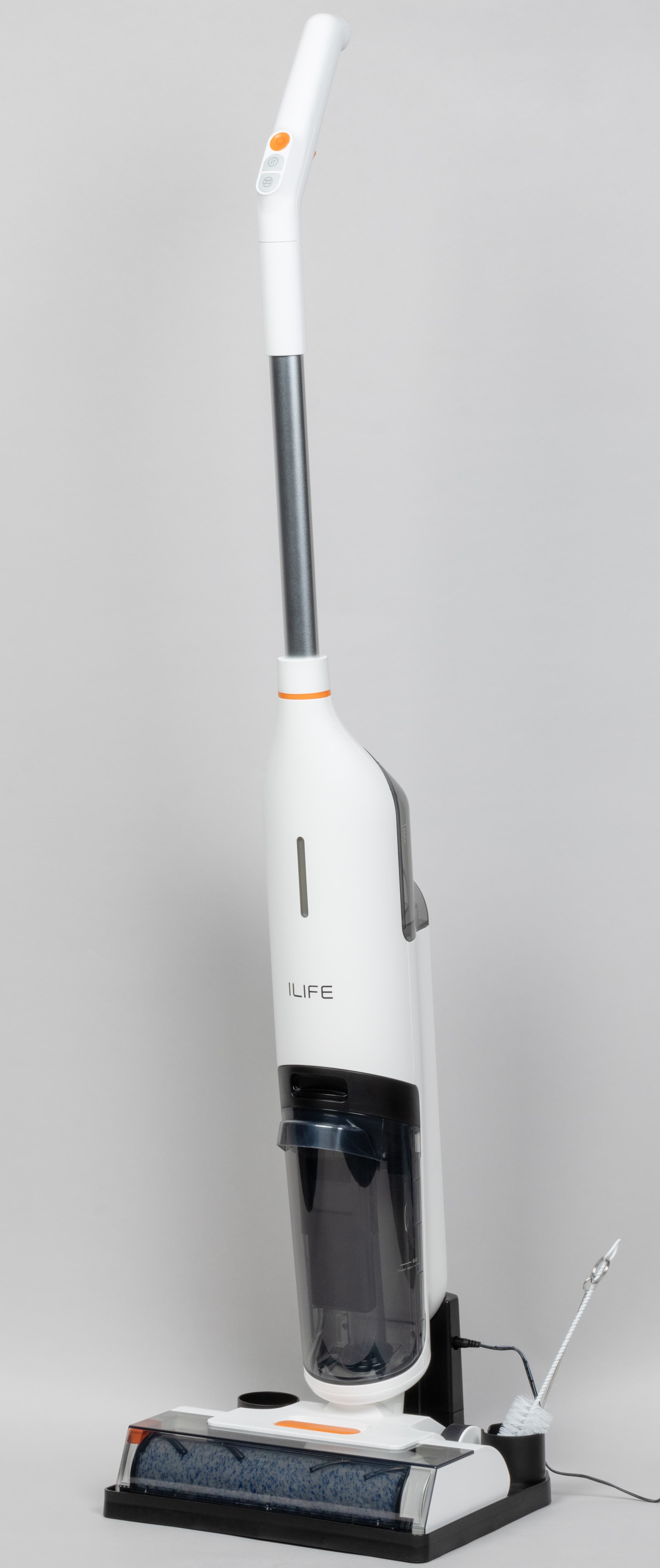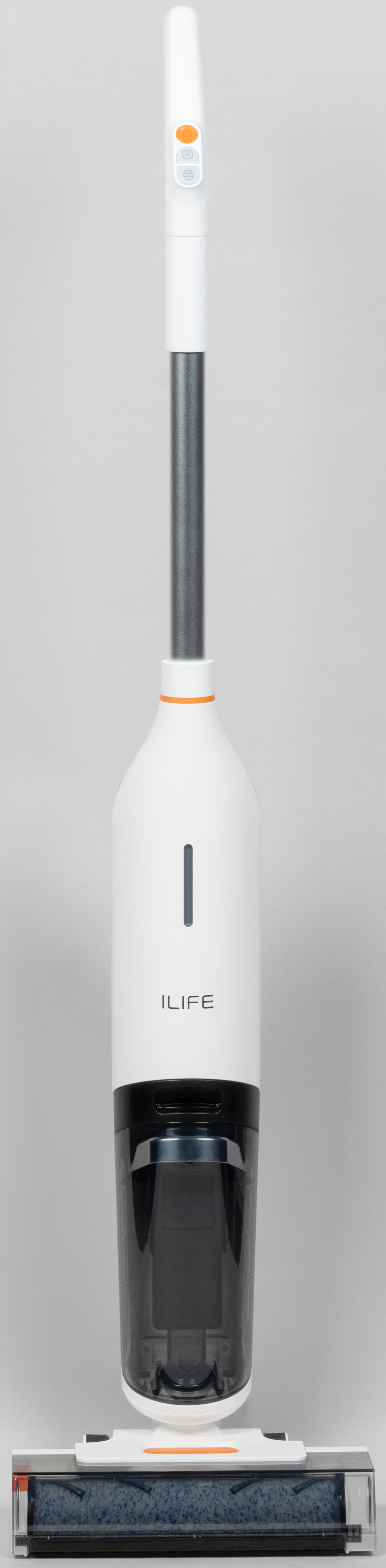 Компоновка iLife W90 традиционна для моющих аккумуляторных пылесосов. В верхней части сигарообразного корпуса размещается резервуар для чистой воды.