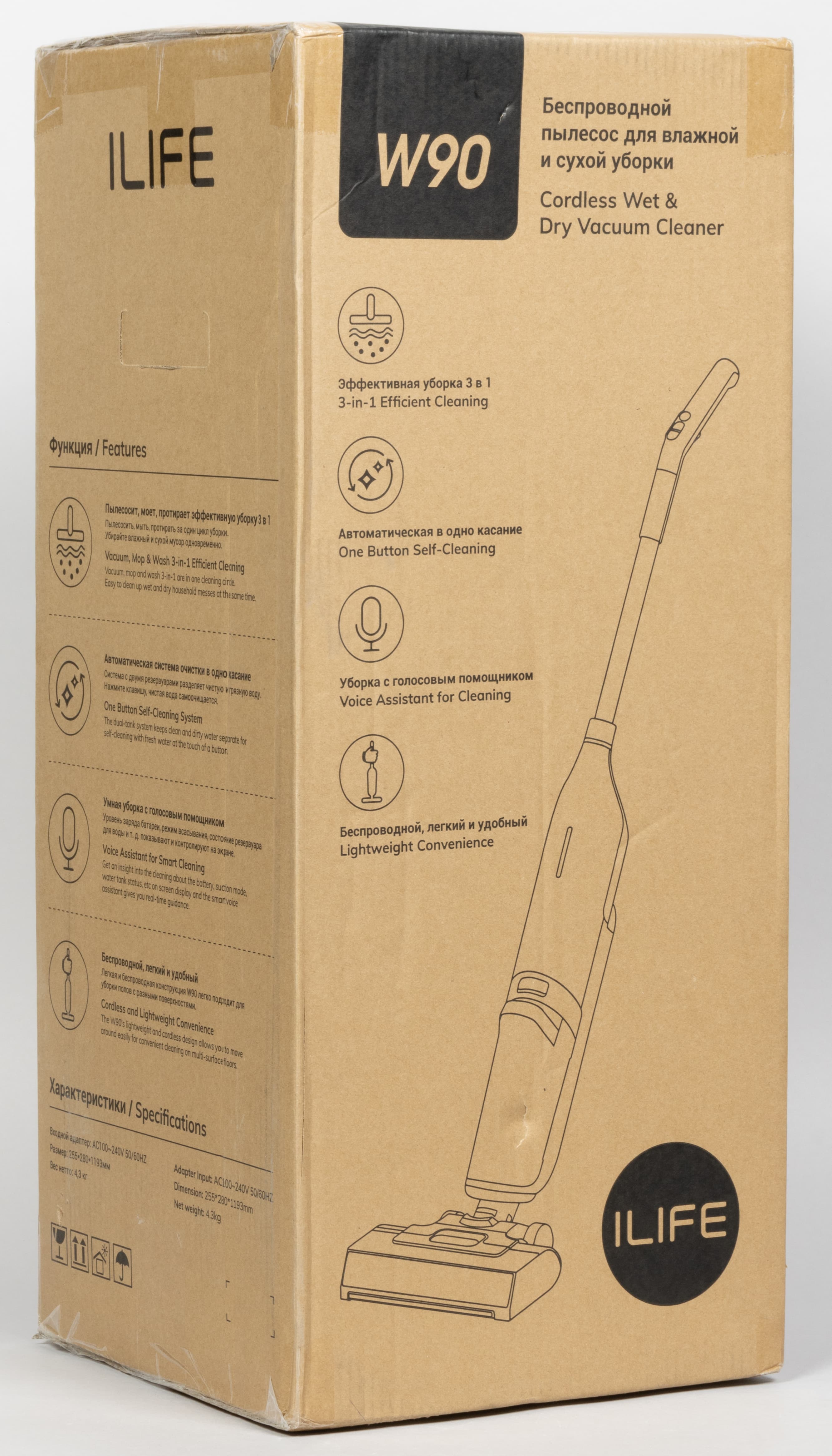 Пылесос поставляется в большой коробке из коричневого картона. На ее передней стороне производитель разместил изображение устройства и перечислил основные, с точки зрения маркетологов, его особенности. Здесь упомянуты эффективная уборка «3 в 1», режим самоочистки, запускаемый в одно касание, наличие голосового помощника, а также легкая и удобная беспроводная конструкция.