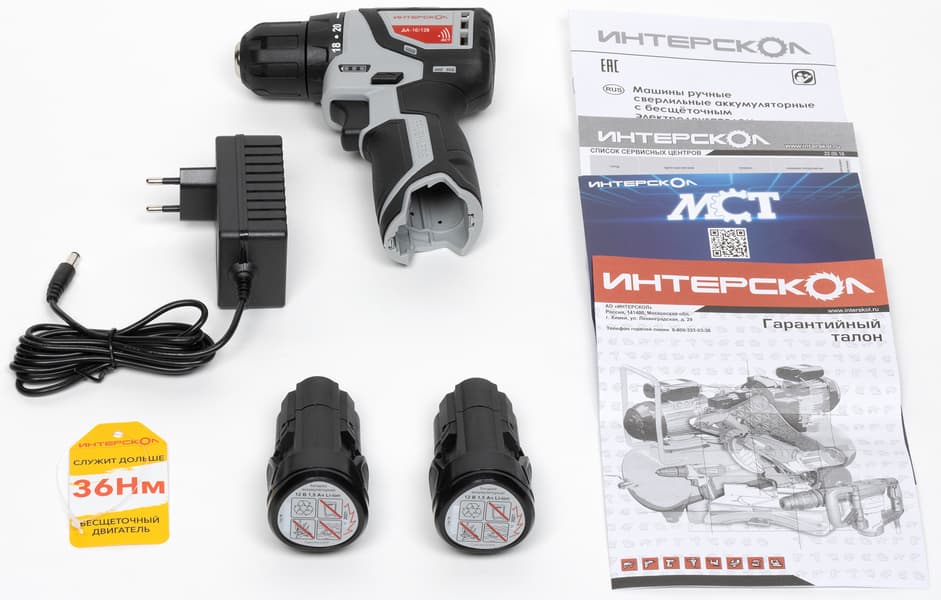 Комплектность состоит из шуруповерта, сетевого адаптера (он же зарядное устройство), двух аккумуляторов, инструкции, гарантийного талона и листовки.