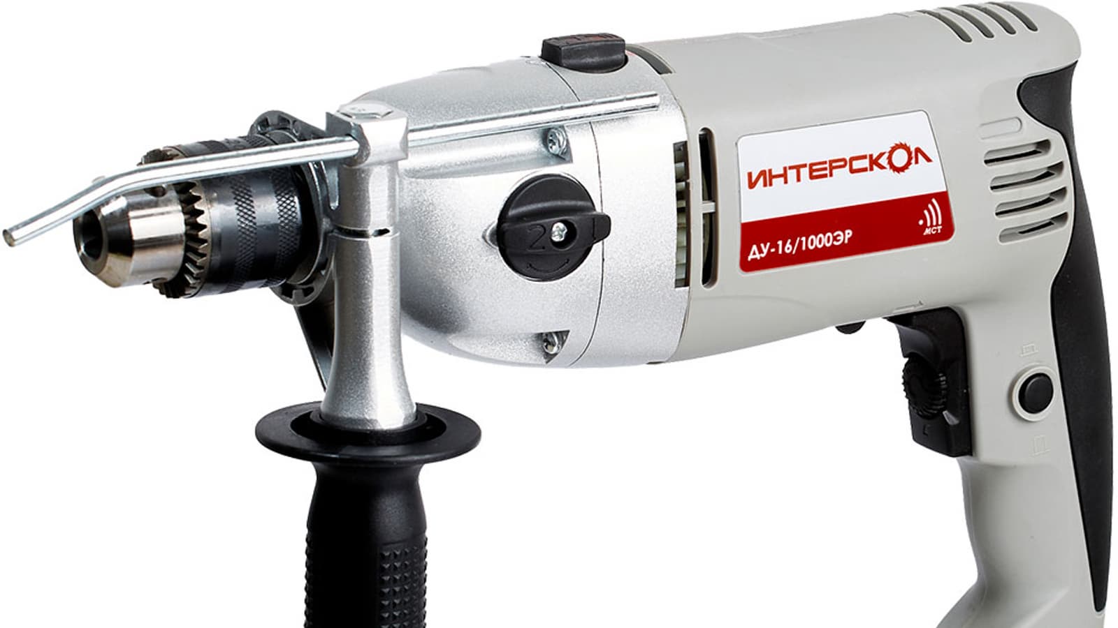 Сверлильная машина (таково ее официальное определение) Интерскол ДУ-16/1000ЭР оснащена двухскоростным редуктором с металлическим корпусом, обеспечивающим надежность при высоких нагрузках. Ударный режим работы ускорит сверление таких материалов, как кирпич или бетон, а высокая мощность двигателя дает возможность использования инструмента для замешивания строительных смесей.