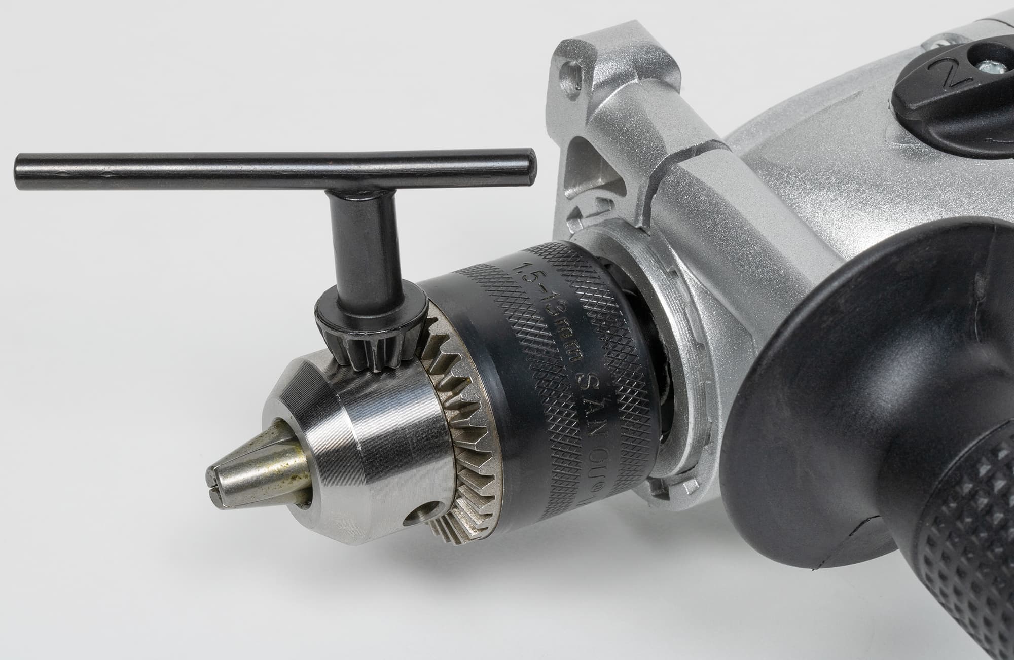 Сверло и другие насадки в патроне фиксируются прилагаемым ключом. Это гораздо надежнее, чем ручная фиксация быстрозажимным патроном, даже если инструмент имеет функцию блокировки шпинделя при неработающем двигателе. Такой патрон позволяет намертво закрепить оснастку с любой формой хвостовика — даже совсем нестандартной или давно не использующейся в промышленности.