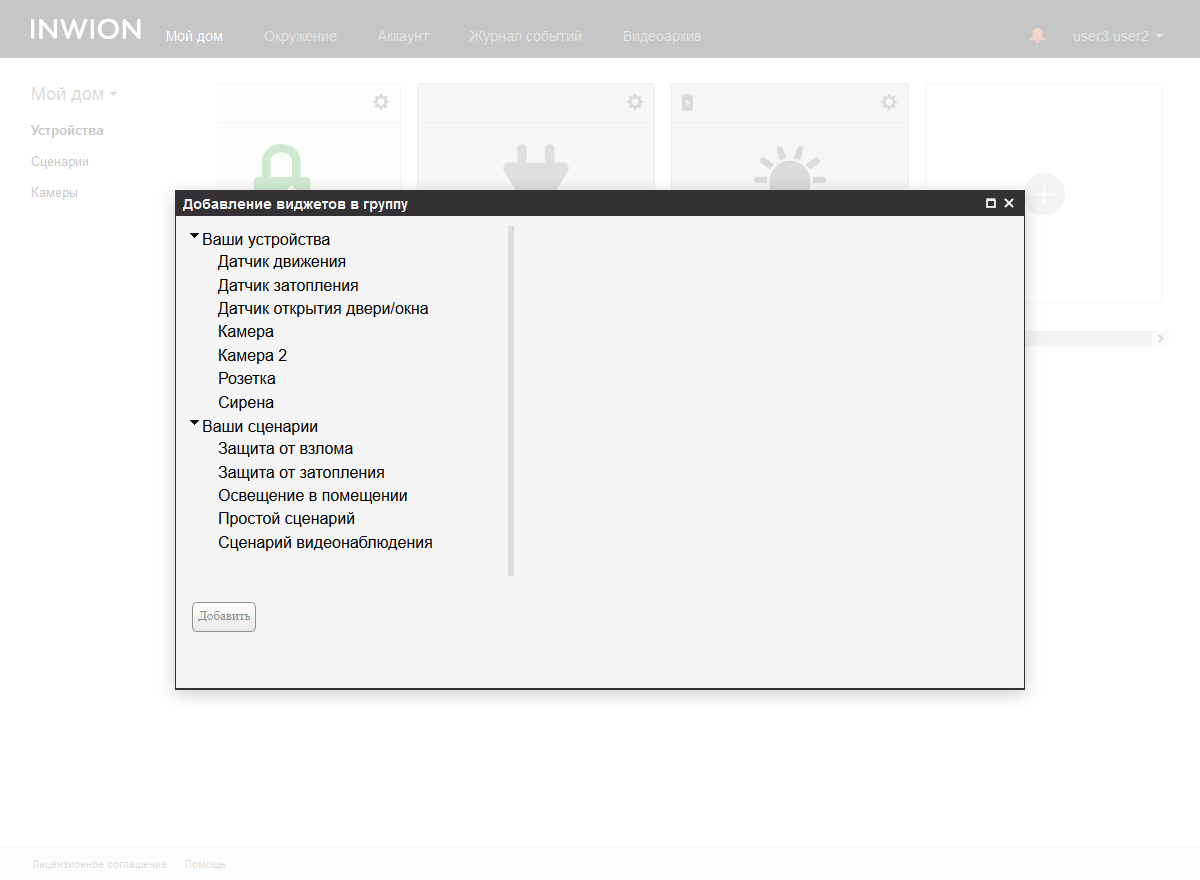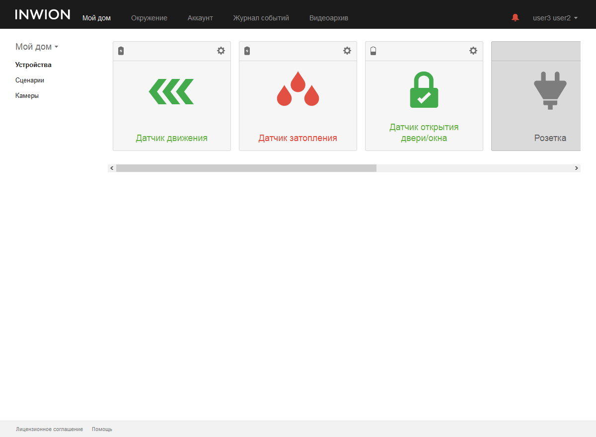 Общее управление системой осуществляется со страницы «Мой дом». Здесь каждый пользователь индивидуально может настроить внешний вид панели управления.