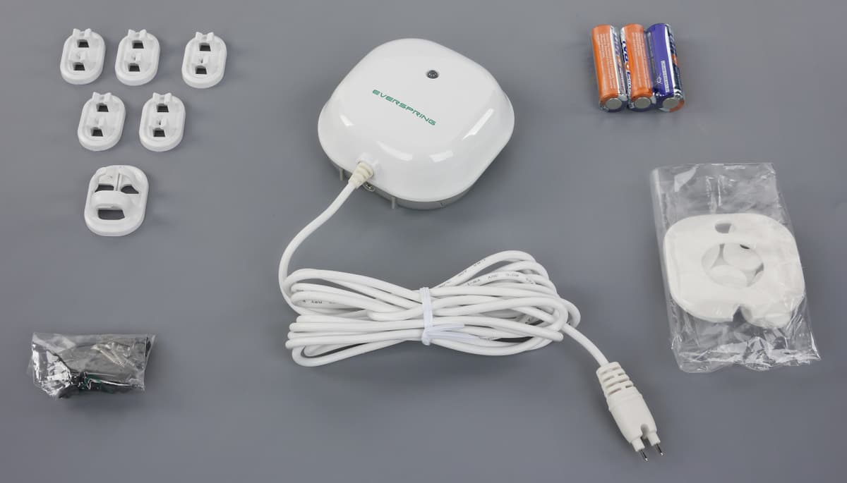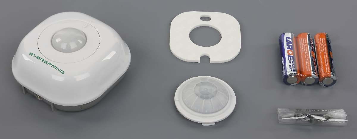 Датчики движения тоже являются частыми гостями в системах домашней автоматизации. Модель SP814 интересная возможностью смены типа линзы для выбора места установки — на стене или на потолке. Второй вариант может быть использован со специальными шторками для ограничения зоны срабатывания по секторам. В комплекте, кроме самого устройства и двух линз, идут элементы питания (три батареи AA), двухсторонняя клейкая пластина и два шурупа с дюбелями.