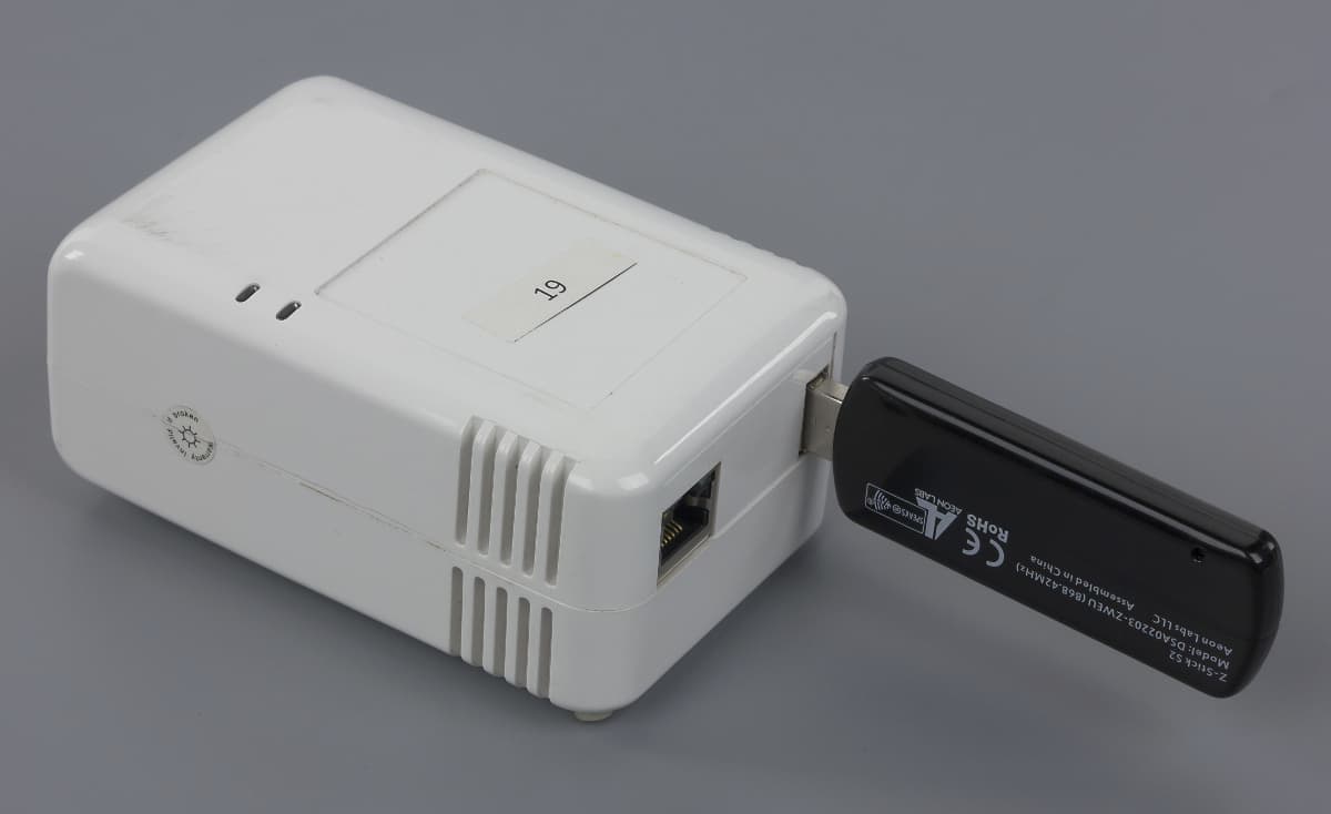 Блок контроллера не имеет встроенного адаптера Z-Wave. Для реализации работы беспроводной сети используется модель Aeon Labs Z-Stick Series 2, подключаемая в порт USB 2.0. Адаптер интересен наличием встроенного аккумулятора и кнопки на корпусе. Эти элементы позволяют легко подключать новые устройства в сеть — достаточно отключить стик от контроллера, разместить рядом с новым устройством, переведенным в режим включения в сеть и нажать кнопку. После обратной установки адаптера в порт контроллера, новые записанные в нем устройства появятся в веб-интерфейсе управления системой.
