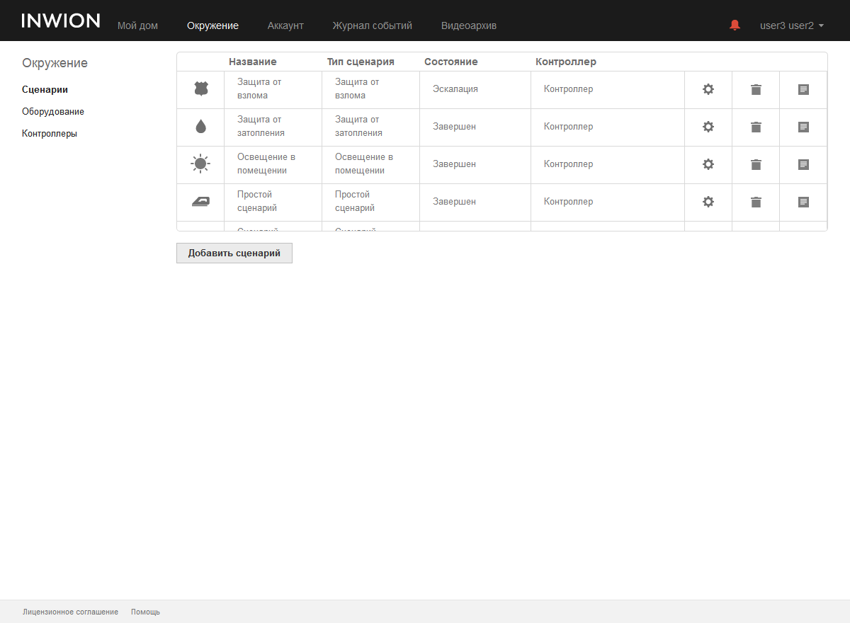 Для автономных моделей на значке отображается статус батареи. Для сценариев есть доступ к журналу связанных с ним событий и переход к редактированию параметров.