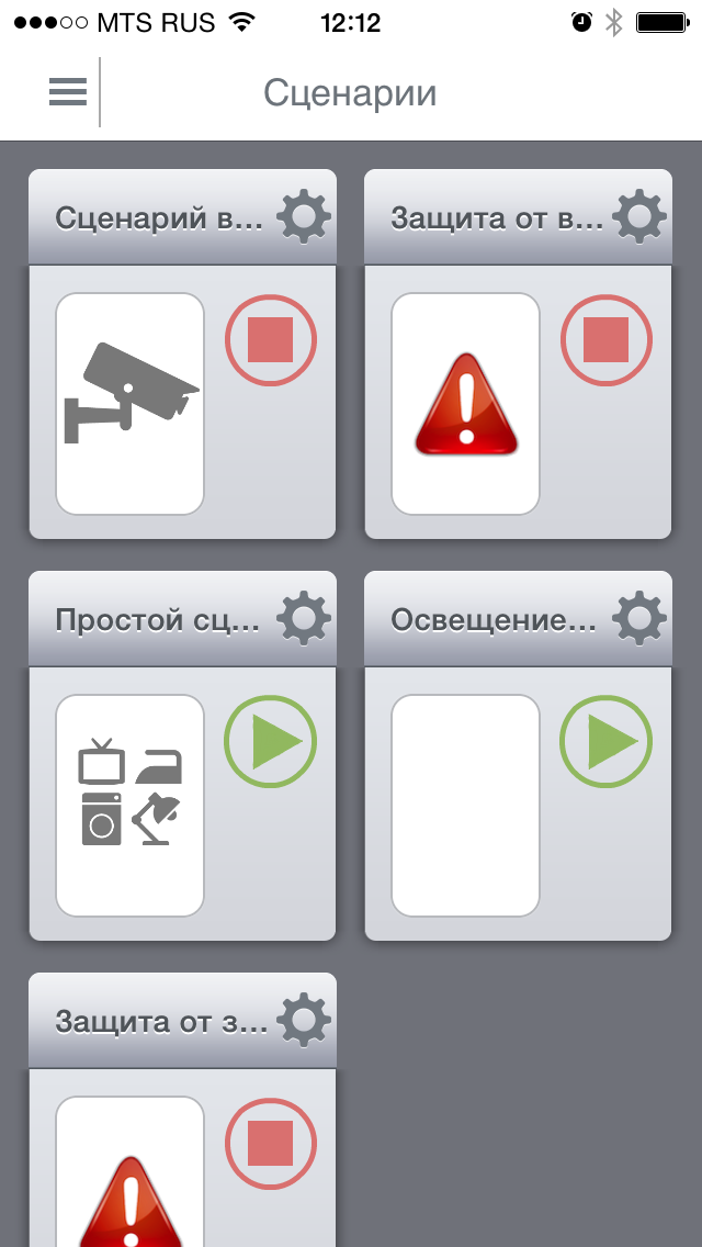Размер иконок устройств и сценариев одинаковый, отображается изменение статуса датчиков, на iOS есть возможность посмотреть информацию об устройствах, включая заряд батареи. Для сценариев предусмотрены операции запуска и остановки, а также индикация срабатывания различных вариантов защит.