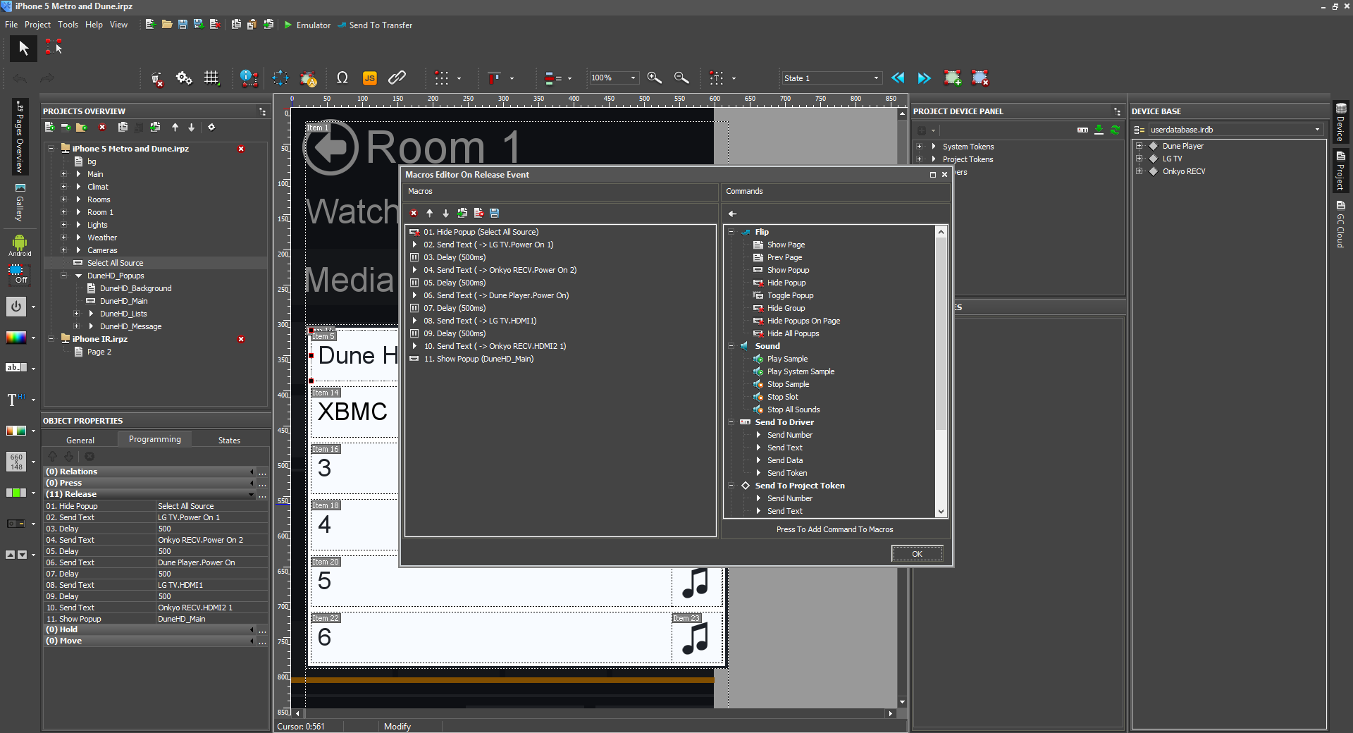 В качестве такого варианта используем загруженные с сайта iRidium образцы интерфейса и панелей управления плеером Dune. После их объедения в одном проекте, настроим вызов меню управления плеером с одной из основных страниц. Причем в скрипт запуска добавим соответствующие ИК-команды для включения и настройки аудио-видео оборудования.