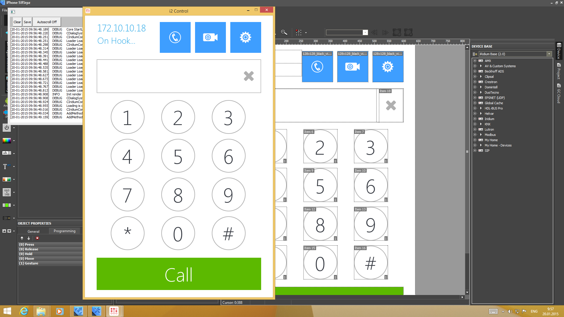 Для работы над проектами используется программа iRidium GUI Editor. Эта многофункциональная утилита имеет встроенные средства для работы над графической составляющей проекта, управления используемыми устройствами и программирования команд. Решение обеспечивает гибкость для реализации любых визуальных эффектов — на страницах интерфейса можно использовать фоновые изображения, кнопки разных дизайнов, слайдеры, текст с собственными шрифтами, анимацию и другие элементы. Например, можно сделать страницу с планом дома для контроля и выбора требуемой комнаты или добавить фотографию помещения с меняющими вид светильниками. Дополнительные возможности обеспечиваются использованием всплывающих окон в дополнение к обычным страницам.