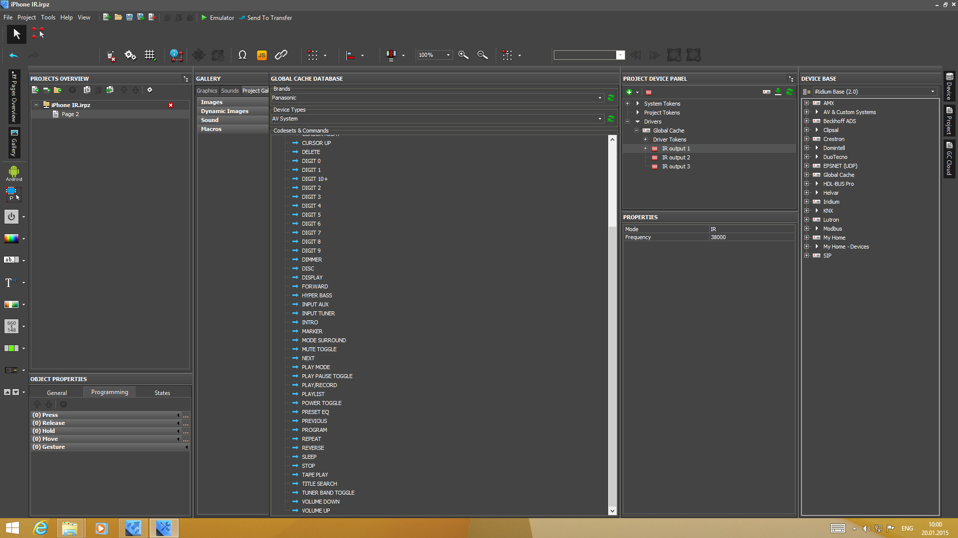 Удобство работы с редактором обеспечивается встроенной галереей с готовыми элементами, деревом устройств, он-лайн каталогом ИК-команд от Global Cache. Все это позволяет использовать операцию «drag-and-drop» вместо текстового ввода параметров и команд. Для знакомства (и использования в своих проектах) можно загрузить с сайта компании готовые интерфейсы, которые созданы тщательно и выглядят как настоящие профессиональные продукты. Благодаря возможности объединения проектов, добавить элементы управления из примеров интерфейсов очень легко.
