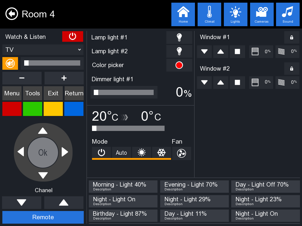Базовыми элементами являются текстовые поля, кнопки, слайдеры, списки и джойстики различных форматов, а также динамические изображения. Практически каждая деталь визуального оформления может быть изменена дизайнером интерфейса, включая цвета, рамки, фоновые изображения, шрифт, прозрачность и многие другие. При этом, многие параметры могут зависеть от полученной от управляемых устройств обратной связи, например слайдер может отражать текущее состояние диммера, даже если оно было изменено с другой панели, а текст может показывать температуру, которую передал соответствующий датчик. В общем случае, в процессе работы проекта можно с использованием скриптов динамически изменять даже такие параметры элемента, как размер и положение. При редактировании элементов предусмотрены операции группировки, выравнивания, изменения порядка, использование сетки и другие известные по графическим редакторам возможности.
