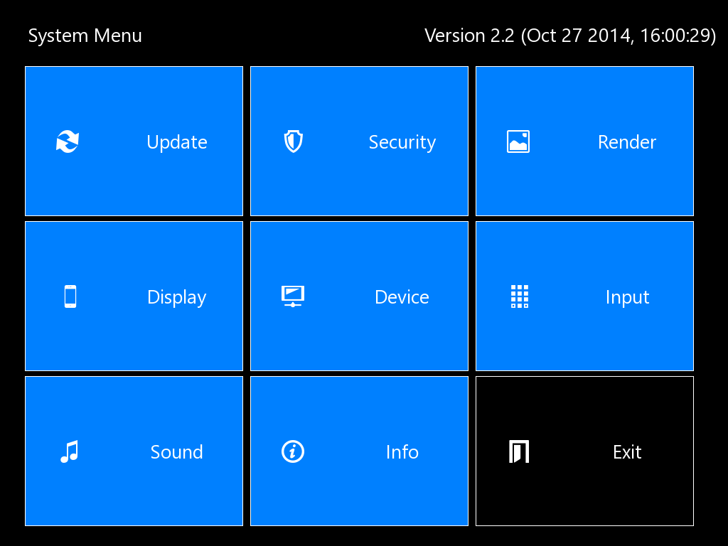 Еще одной функцией программы является вызов системного меню на панели. В нем предусмотрены следующие возможности: загрузка обновления с сервера, смена паролей проекта, изменение параметров системы рендеринга (в том числе и регулировка яркости), звуковой системы и устройств ввода, изменение параметров подключения драйверов к оборудованию (например, IP-адресов), включение удаленной отладки и другие.