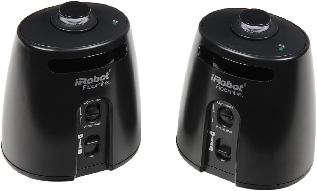 Эти устройства работают от двух элементов питания типа LR14 (или C, или А343, можно использовать и солевые). Устройства могут работать в двух режимах — виртуальная стена (Virtual Wall) и маяк (Lighthouse). В первом случае в направлении от устройства создается виртуальная преграда, которую пылесос не пересекает. С помощью этой виртуальной стены можно отгородить места, где выполнять уборку нежелательно. Режим маяка используется для установления последовательности уборки: заехав в помещение/закуток, ограниченное маяком, пылесос останется в нем, пока не уберет это пространство. Режим работы и длина виртуального барьера выбираются переключателями на корпусе устройства. Включаются устройства автоматически при запуске пылесоса в режиме уборки, выключаются тоже автоматически после окончания уборки. Видимо, в режиме уборки пылесос периодически излучает соответствующий сигнал (скорее всего, радиочастотный), приняв который, устройства навигации автоматически активируются. Такой режим удобнее, чем ручное включение виртуальных стен, и существенно сокращает расход заряда элементов питания.