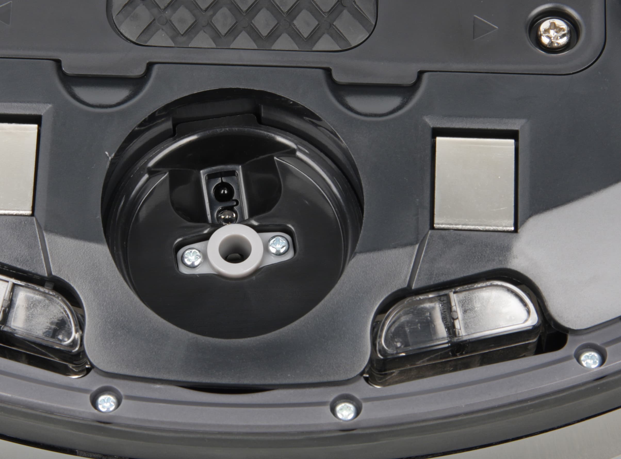 Перевернув пылесос вверх днищем, мы видим две контактные площадки, подруливающий ролик, боковую щетку, крышку отсека АКБ, два ведущих колеса на подпружиненных рычагах, отсек с основными щетками и днище отсоединяемого пылесборника. По периметру днища ближе к краю расположены шесть ИК-датчиков перепада высоты.
