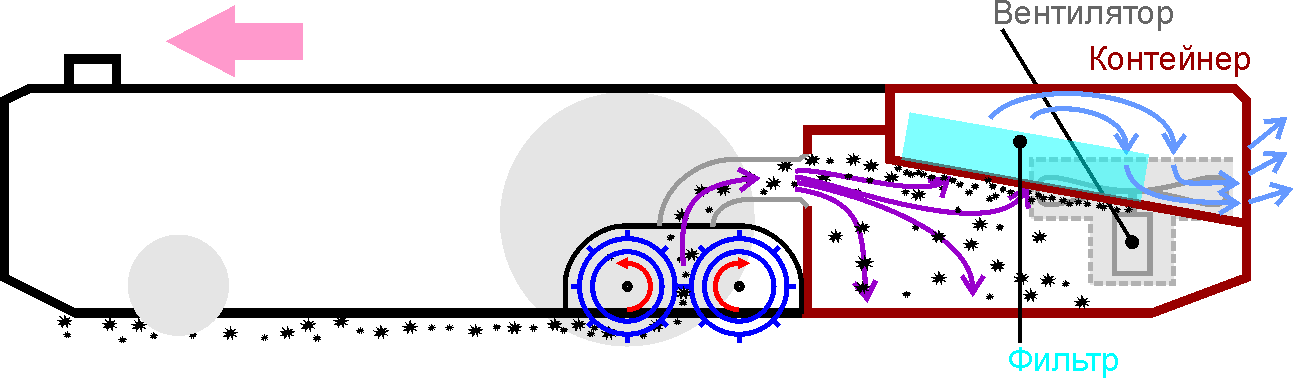 С другой — ось заканчивается шестигранником или квадратом, что соответствует ответной части в механизме вращения щеток. Дополнительную упругость внешней оболочке щеток придает находящийся внутри цилиндров наполнитель из поролона. Вращающиеся щетки сначала подхватывают мусор с пола, затем мусор воздушным потоком перемещается в емкость пылесборника. Тяжелый мусор остается на дне емкости, а мелкий и легкий задерживается воздушным фильтром. Примерная схема, представленная ниже, демонстрирует основной принцип сбора мусора: