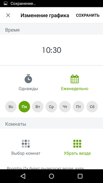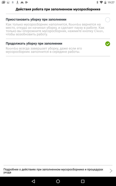 При использовании мобильного приложения становятся доступными две опции: выполнять уборку за один проход, за два или за два и более для малых помещений и за один для больших (так по умолчанию); продолжать работу при заполненном пылесборнике или приостановить уборку при его переполнении.