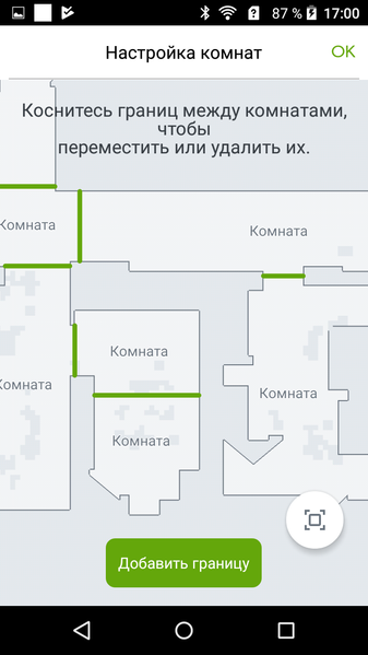 Самое главное новшество заключается в том, что робот строит карту убираемого помещения, на которой в автоматическом режиме выделяет отдельные комнаты (разделение можно исправить вручную). Притом таких карт может быть несколько (например, по этажам в доме), в зависимости от количества помещений, в которых работает робот. На созданных картах пользователь может указать роботу, в какой комнате или в каких комнатах нужно убрать. Заявляется, что построение карты возможно для помещений площадью не более 185 м², а всего храниться может не более 10 карт. На сайте производителя в ответах на вопросы встречается утверждение о возможности создания на картах прямоугольных запретных зон (Keep Out Zones), куда роботу запрещено заезжать, но на самом деле такой функции нет (или не было на момент тестирования), поэтому для ограничения доступа придется использовать виртуальную стену (см. ниже).