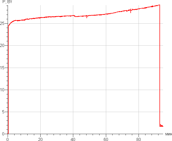 На полную зарядку батареи уходит примерно 1 час и 30 минут. В процессе зарядки пылесоса на базе потребление от электросети доходит до 29 Вт. Если пылесос включен, заряжен и находится на базе в состоянии готовности, то от сети потребляется порядка 1,7 Вт. График потребления от сети во время зарядки: