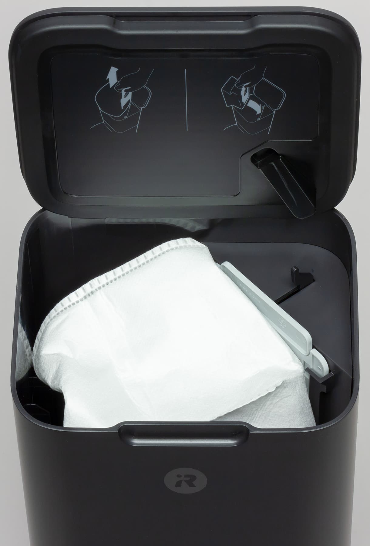 По данным производителя, мешка хватает на сбор мусора из 30 пылесборников робота. Цикл опустошения пылесборника включается каждый раз, когда робот припарковывается на базе в автоматическом режиме, также этот цикл можно запустить вручную, нажав на кнопку с изображением домика на роботе, или из мобильного приложения. Заполненный мешок за ручку извлекается из отсека в базе, при этом входное отверстие в мешке перекрывается шторкой, и никакая пыль наружу не летит.