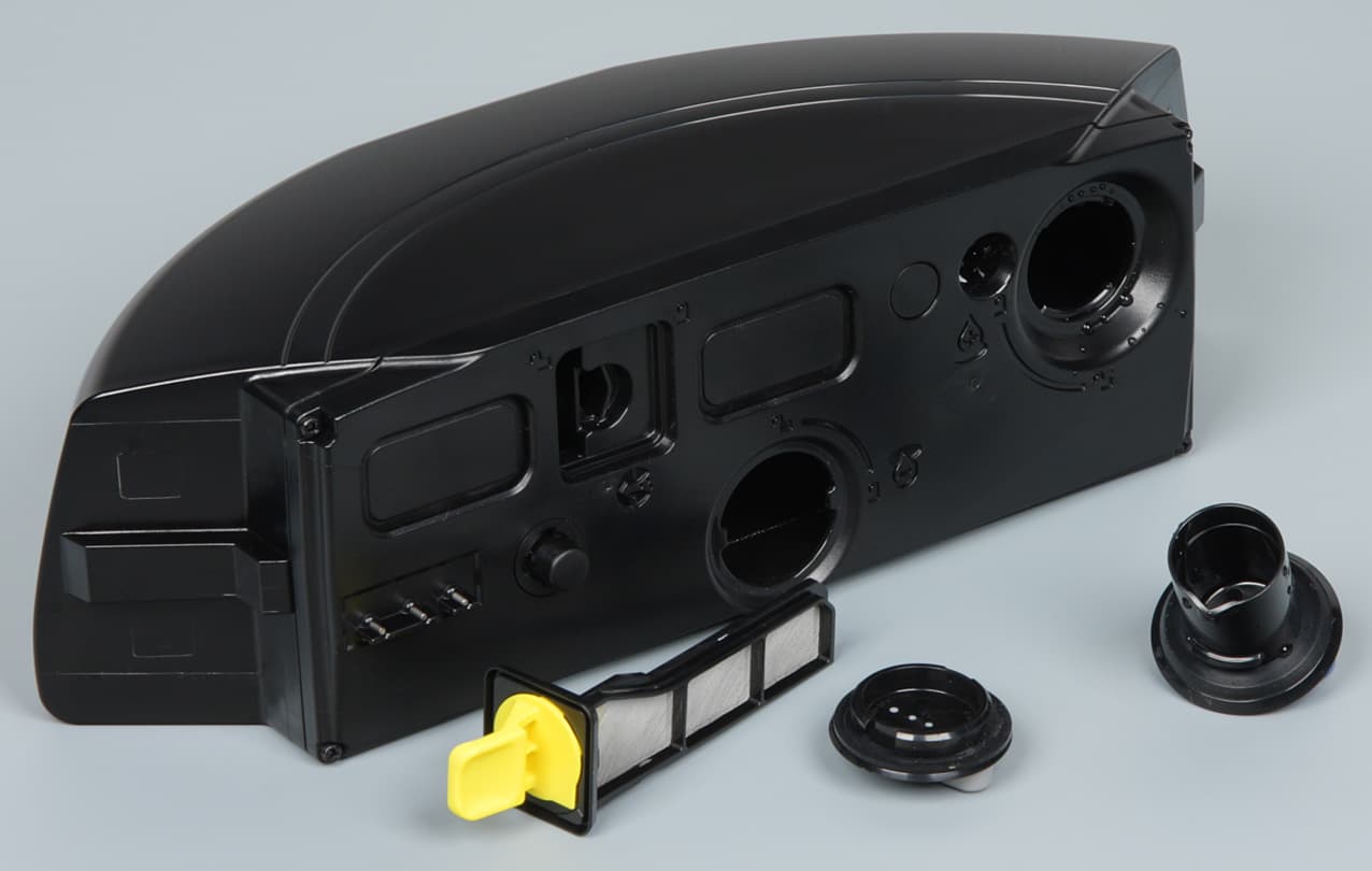 На заднюю плоскую часть бака приклеена резиновая накладка с заходом ребристой части на нижнюю поверхность. В итоге бак удобно держать одной рукой при манипуляциях с ним, и он, бак, устойчиво стоит на заднем торце (впрочем, как и робот в сборе), что облегчает, например, заливку в бак воды и моющего средства.