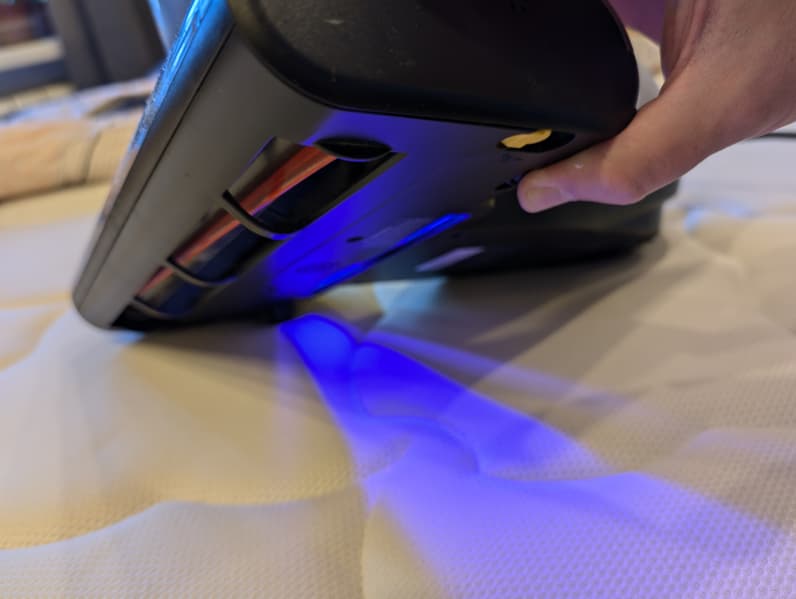 Справа и слева от УФ-излучателя — два подвижных ролика. Они не только служат для облегчения скольжения по мягкой мебели, но и работают как датчики поверхности, отключая ультрафиолет, если пылесос приподняли над матрасом. Так реализована защита зрения от малополезного излучения.