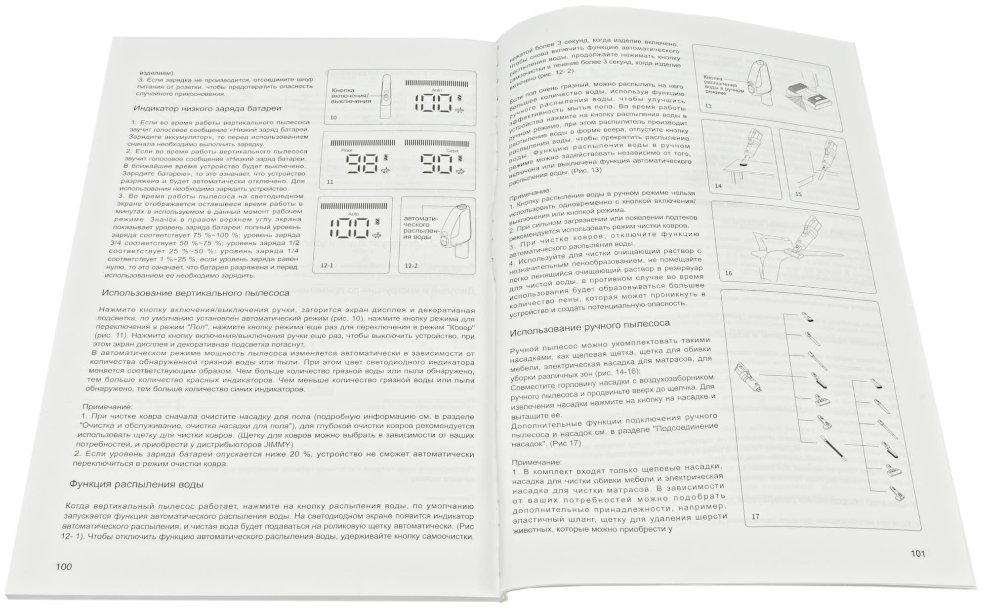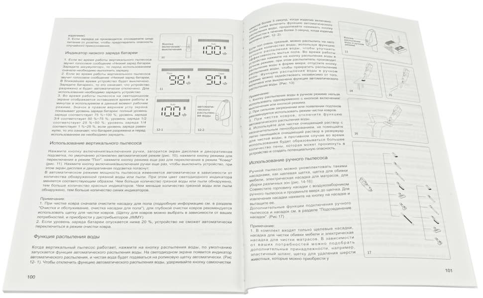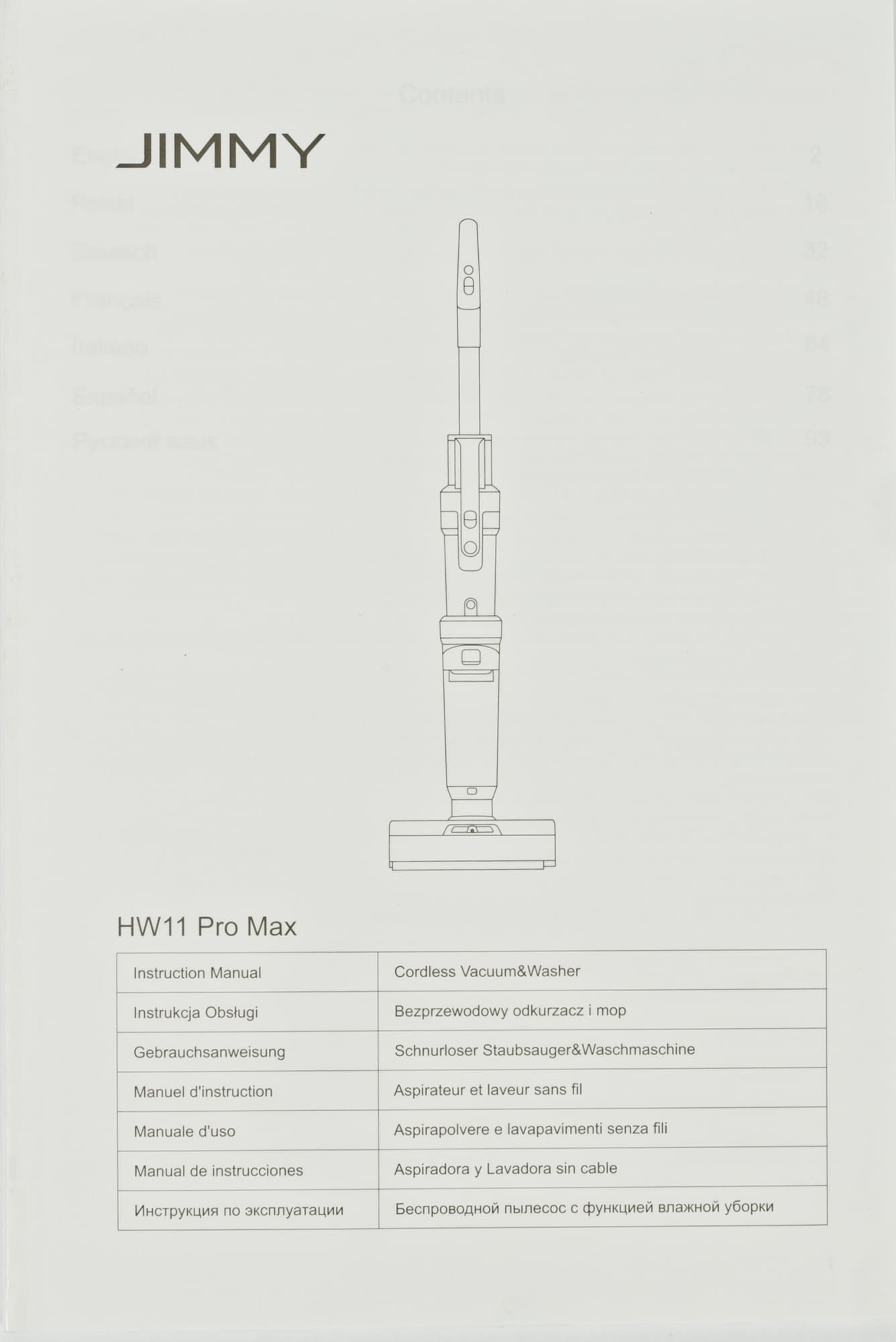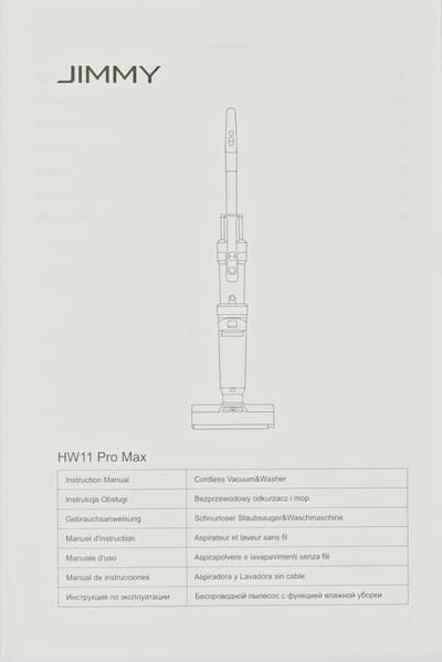Русскоязычная часть документа занимает 17 страниц со множеством иллюстраций. На них подробно описывается конструкция Jimmy HW11 Pro Max, его сборка, подготовка к работе, управление устройством и его эксплуатация. Документ дает советы по уходу за пылесосом, а также содержит список возможных неисправностей с методами их самостоятельного устранения.