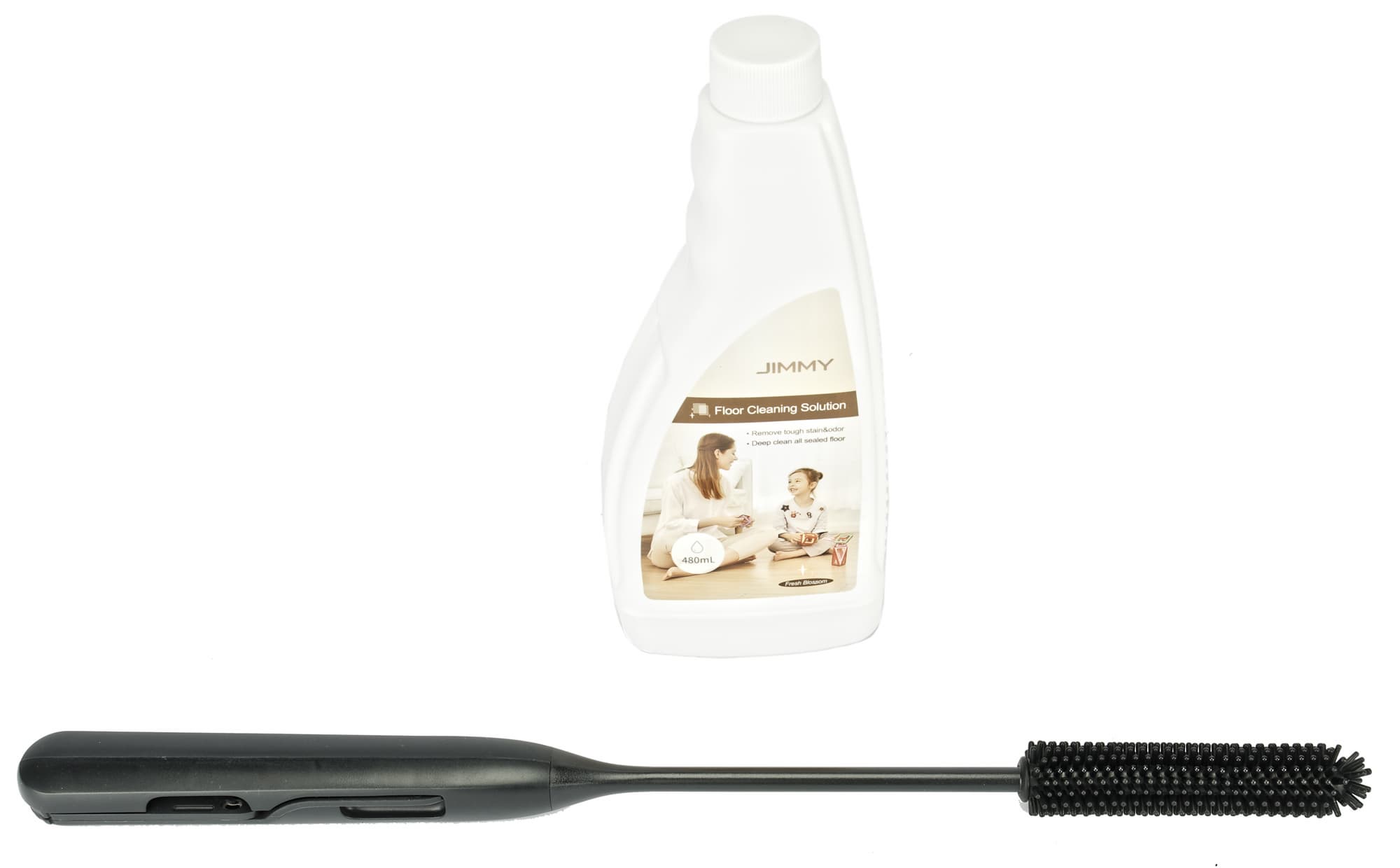 В комплект пылесоса входит резиновый ершик — им чистят резервуар для грязной воды. Диаметр аксессуара соответствует размеру внутренней шахты емкости. Также в коробку с пылесосом вложен флакон емкостью 0,48 л с фирменным средством для мытья пола.