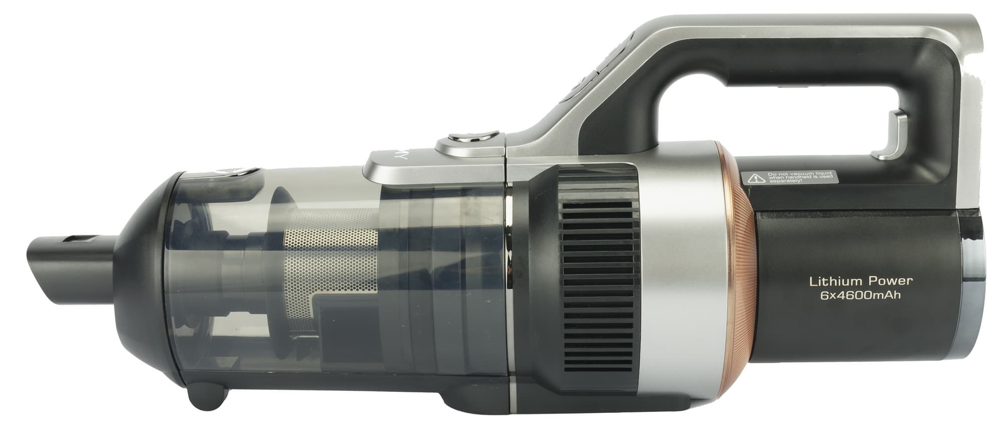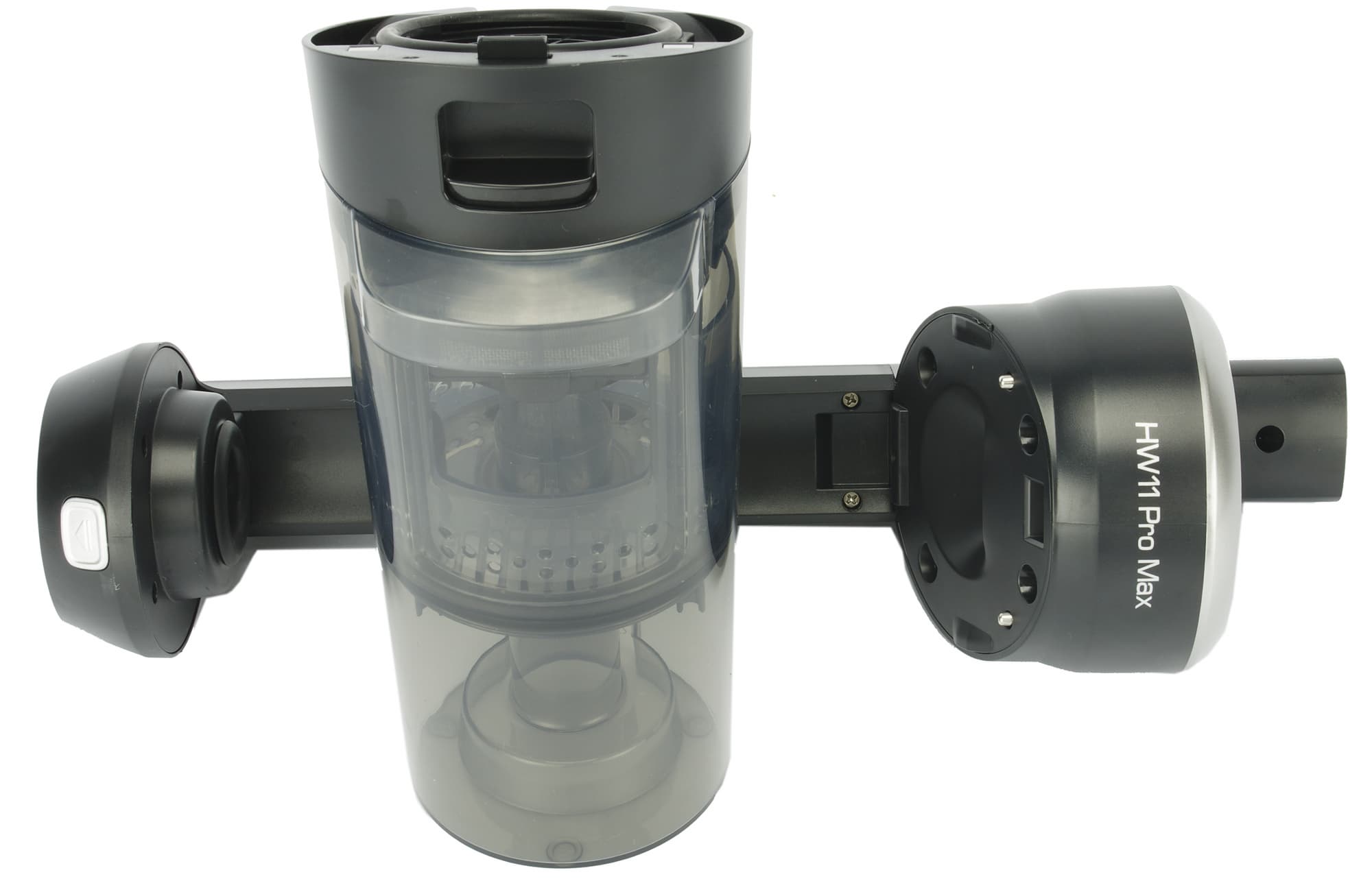 Как и предыдущая модель, HW11 Pro Max сконструирован по продольной схеме: воздушный тракт, циклонный фильтр и двигатель расположены на одной оси. Выдуваемый из моторного блока воздух покидает корпус через решетки справа и слева: такое решение не позволяет потоку разметать неубранную пыль из рабочей зоны и беспокоить хозяина.