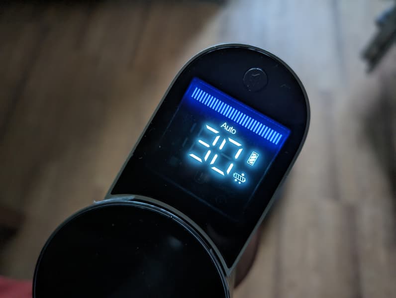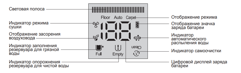 На светодиодном дисплее при работе устройства вместо привычного уровня заряда батареи отображается предполагаемое время работы в минутах. Над цифрами горит название текущего режима работы: «Floor», «Auto» или «Carpet».