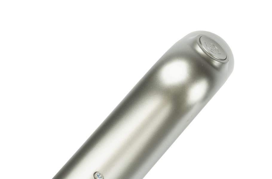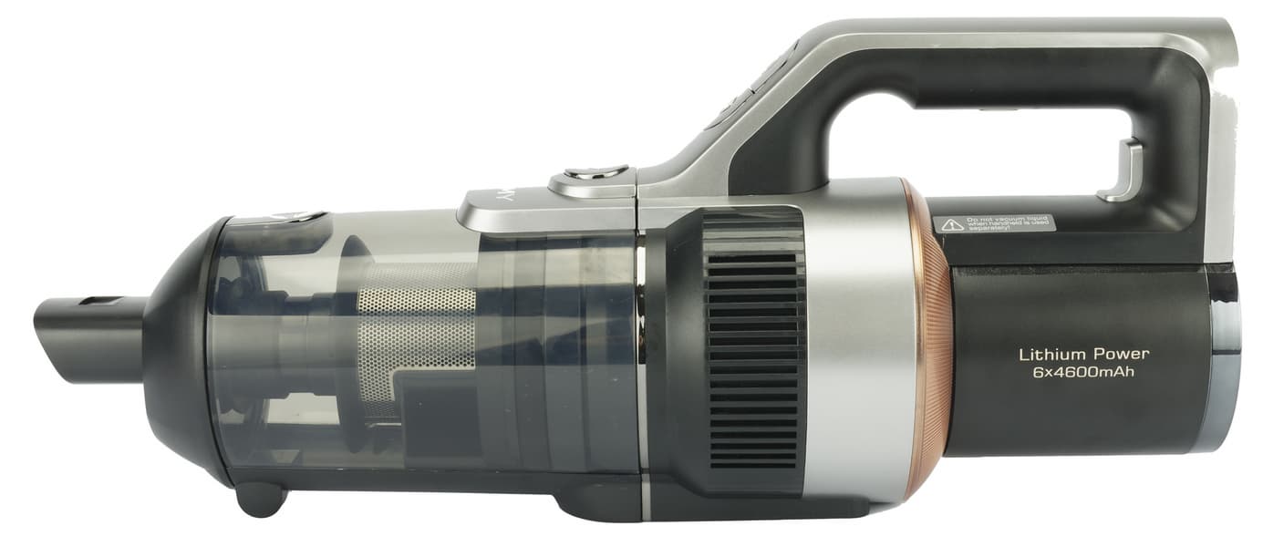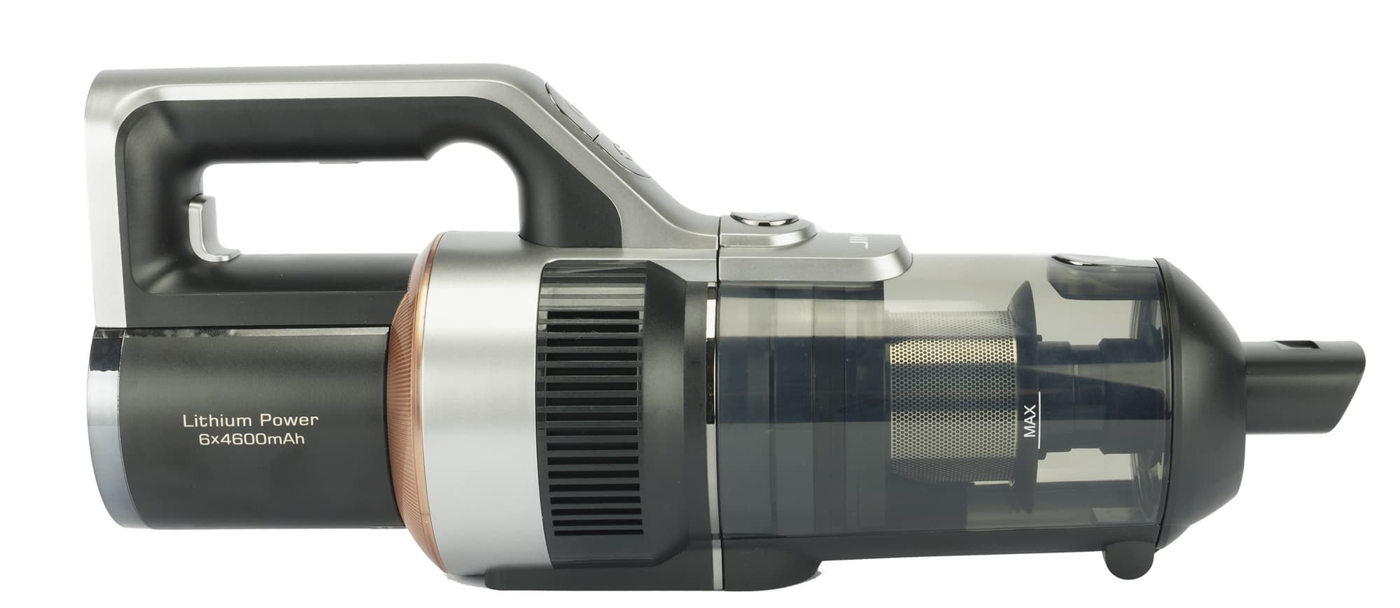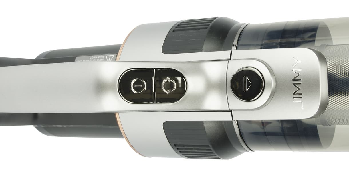Моторный блок Jimmy HW11 Pro Max сделан из темно-серого и серебристого пластика и украшен декоративной вставкой «под красное золото». С виду устройство очень похоже на предыдущую модель этого производителя, которую мы рассматривали не так давно. Но внимательный взгляд отмечает и некоторые отличия: в этом пылесосе использован более емкий аккумулятор, чуть изменена конструкция сопла и по-другому расположена кнопка, фиксирующая батарею.
