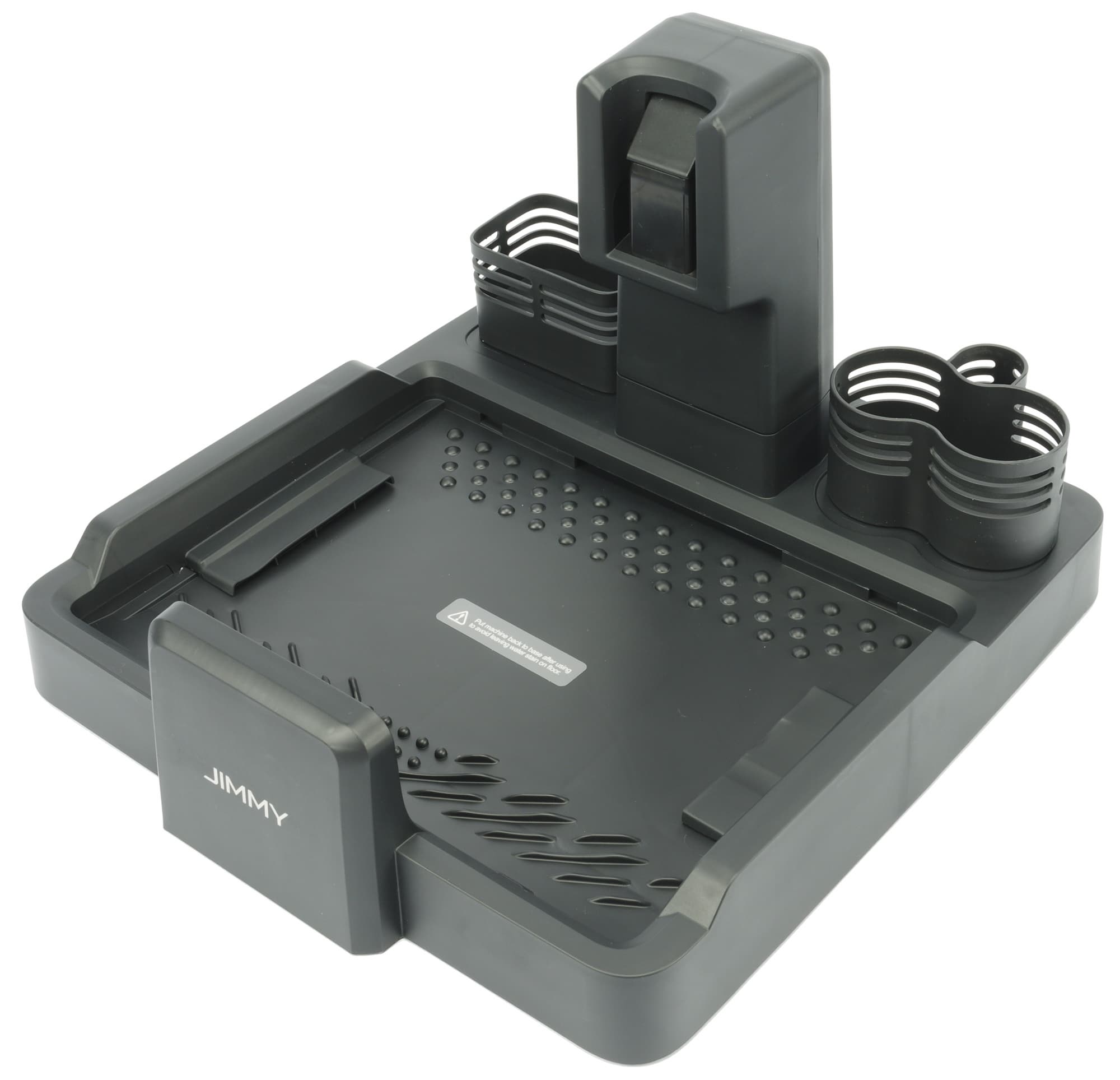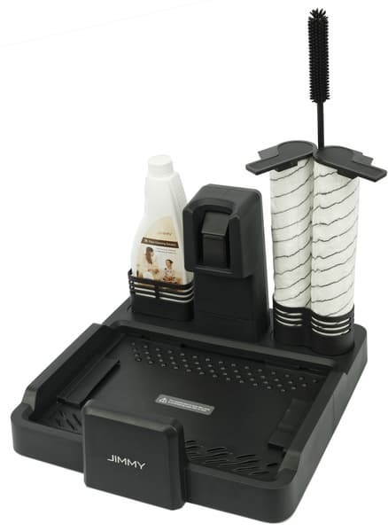 Для обслуживания и зарядки предназначена базовая станция из черного пластика. В передней части ее плоского поддона есть углубление, где при самоочистке промываются оба ротора напольной насадки. Внутри корпуса установлен вентилятор для сушки щеток. Теплый воздух подается на них в течение нескольких часов после промывки — это исключает появление неприятных запахов и препятствует размножению вредной микрофлоры на велюровых элементах.