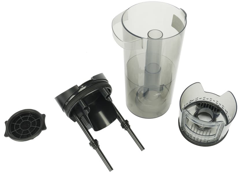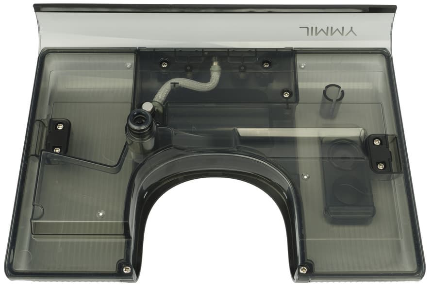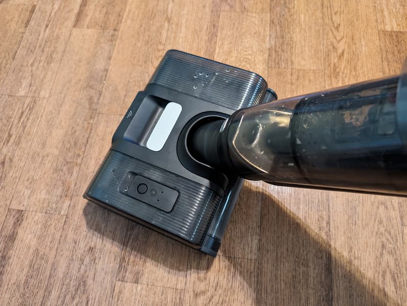 Блок для влажной уборки состоит из двух частей. Спереди — контейнер для грязной воды и влажного мусора с системой фильтрации. Накопитель присоединяется к корпусу, в который сверху вставляется удлинительная трубка, а снизу — насадка с электрощеткой.