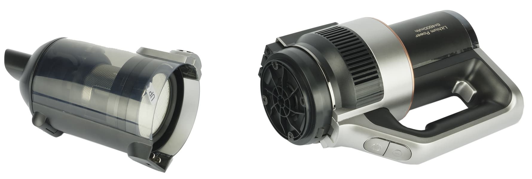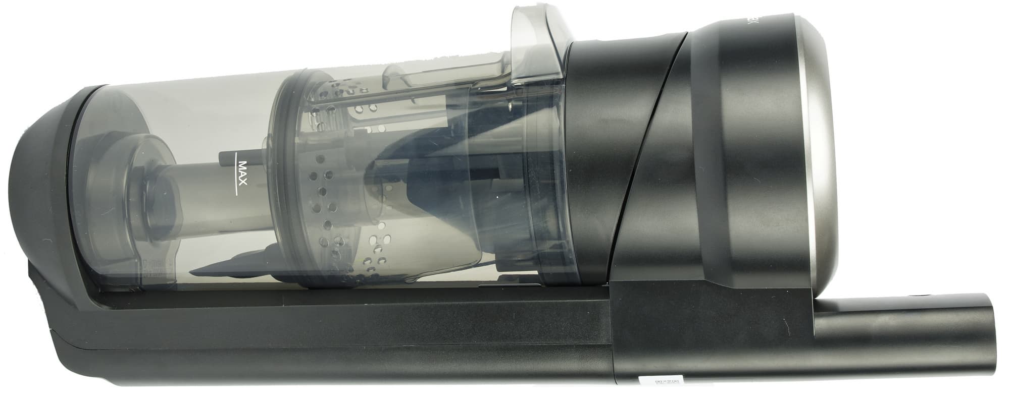 В верхней части корпуса располагается D-образная рукоятка с двумя кнопками управления на ней. Третья регулирует защелку, удерживающую мусоросборник. А четвертая, ближе к переднему торцу, открывает сам контейнер для пыли: вытряхивать его можно, не снимая с корпуса и не пачкая рук.