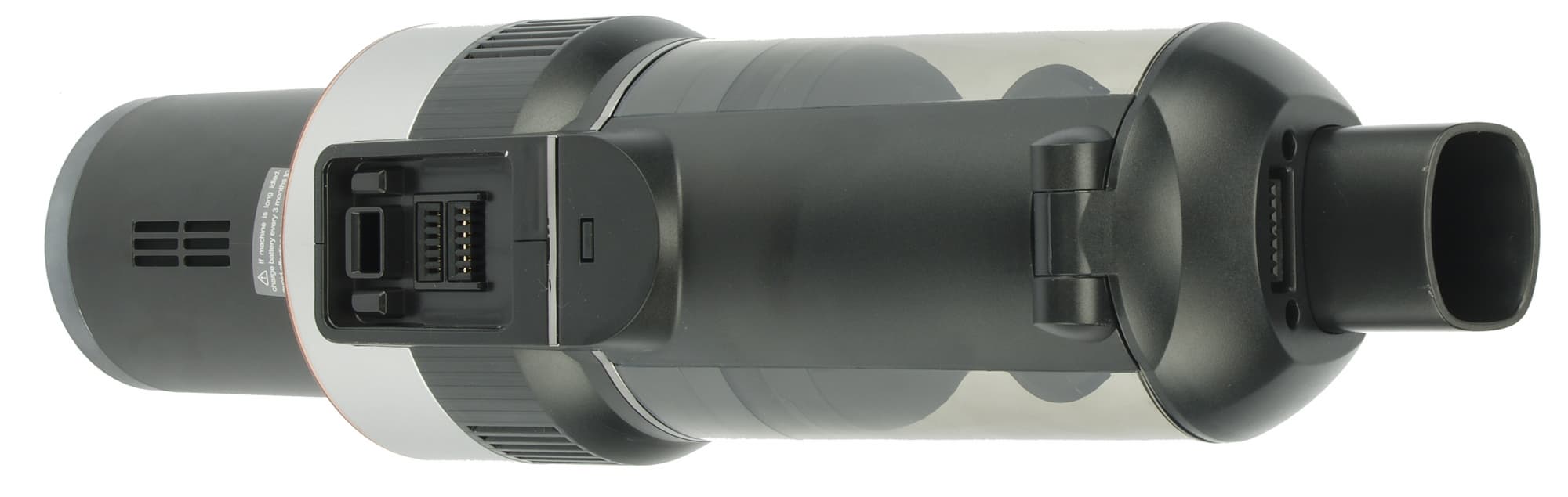На нижней стороне корпуса мы видим 12-контактный разъем, с помощью которого устройство присоединяется к удлинительной трубке. Он обеспечивает управление, питание электрощетки для пола и зарядку аккумулятора.