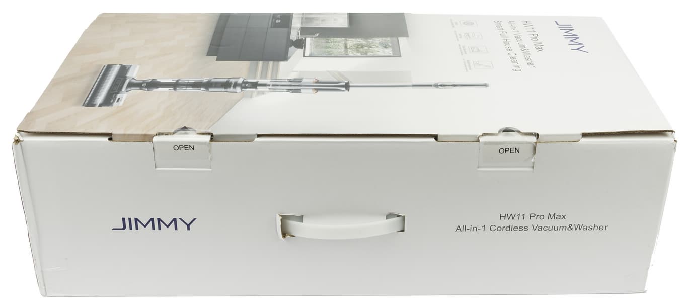 Пылесос Jimmy HW11 Pro Max поставляется в большой картонной коробке с пластиковой ручкой. На передней стороне упаковки производитель разместил цветную фотографию устройства в интерьере. Здесь же перечислены основные достоинства модели. Среди них — возможность отсоединять ручной пылесос для чистки мебели, уборка с одновременным всасыванием мусора и мытьем, быстрое высыхание поверхностей после влажной уборки и функция самоочистки ротора.