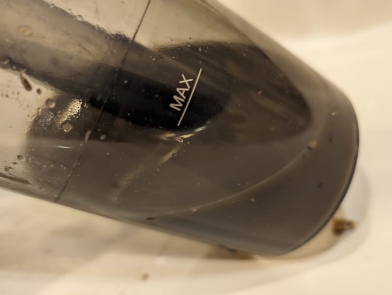 После завершения влажной уборки устройство нужно установить на базу, слить грязную воду из резервуара, наполнить нижний бак чистой водой и кнопкой на рукоятке запустить режим самоочистки. В течение пары минут пылесос промывает щетку, периодически увеличивая мощность до максимума, чтобы прочистить воздушный тракт, а затем напоминает о необходимости еще раз вылить грязную воду и пополнить запас чистой.