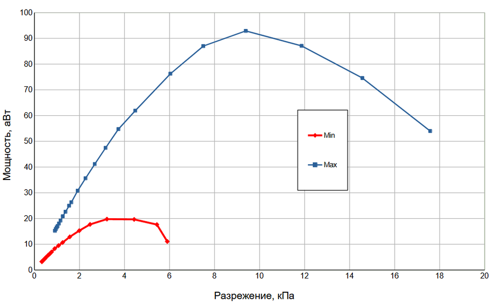 Измеренные нами значения составили 92,9 аВт в максимальном режиме и 19,4 аВт в минимальном. При полностью закрытой задвижке стенда срабатывает защита от перегрева — и прибор выключается: это можно видеть на обоих графиках.