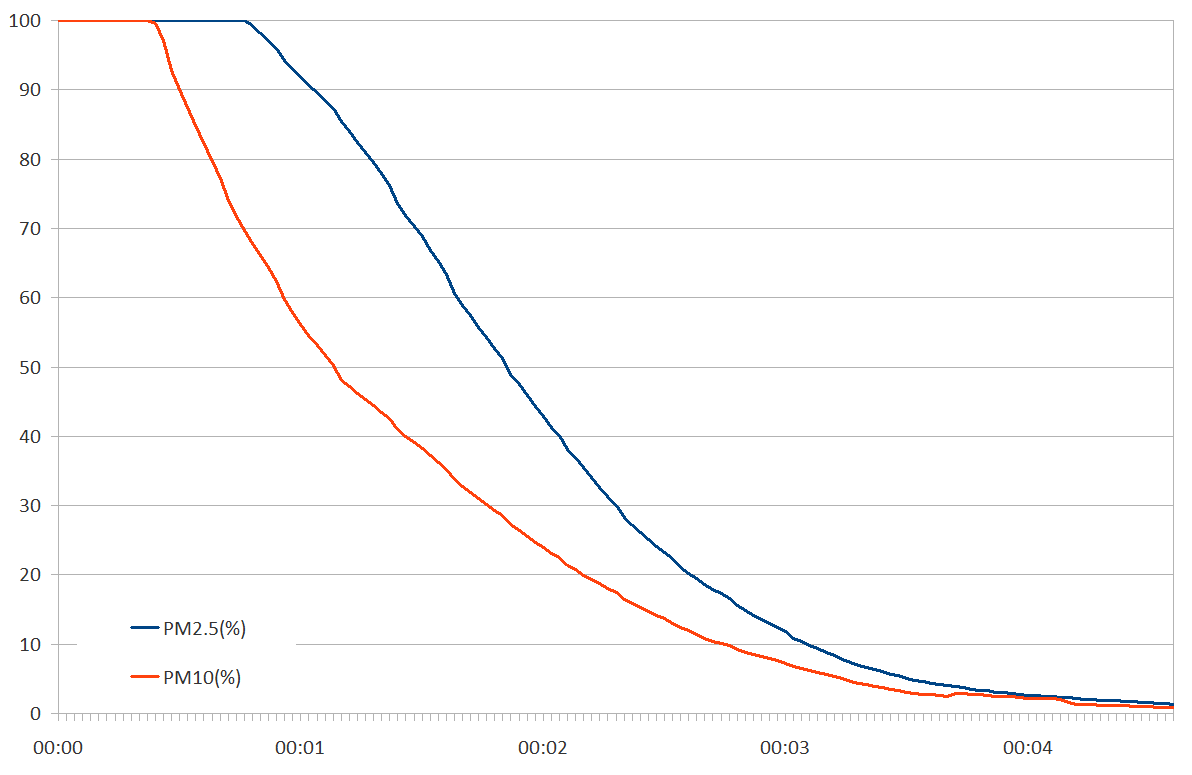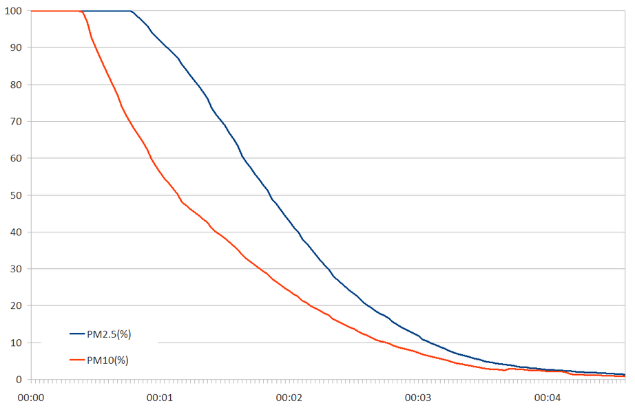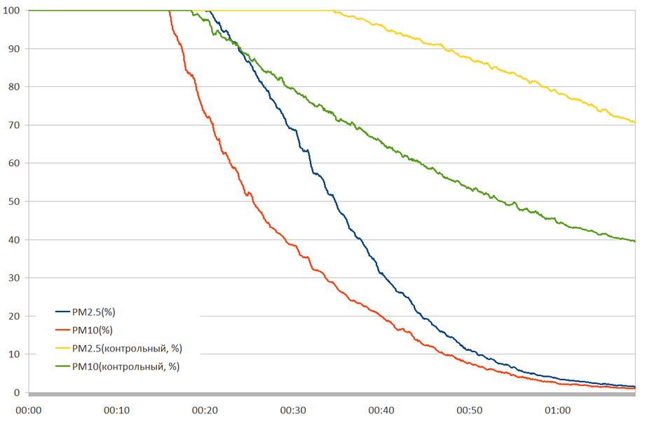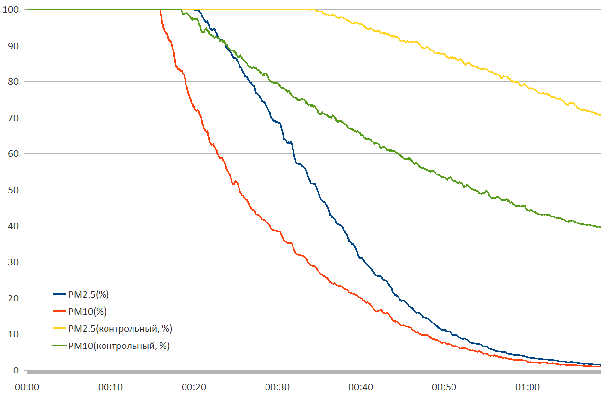 | Снижение загрязнения частицами PM2.5 на 50% от максимума, мин:сек | 1 минута 59 секунд |