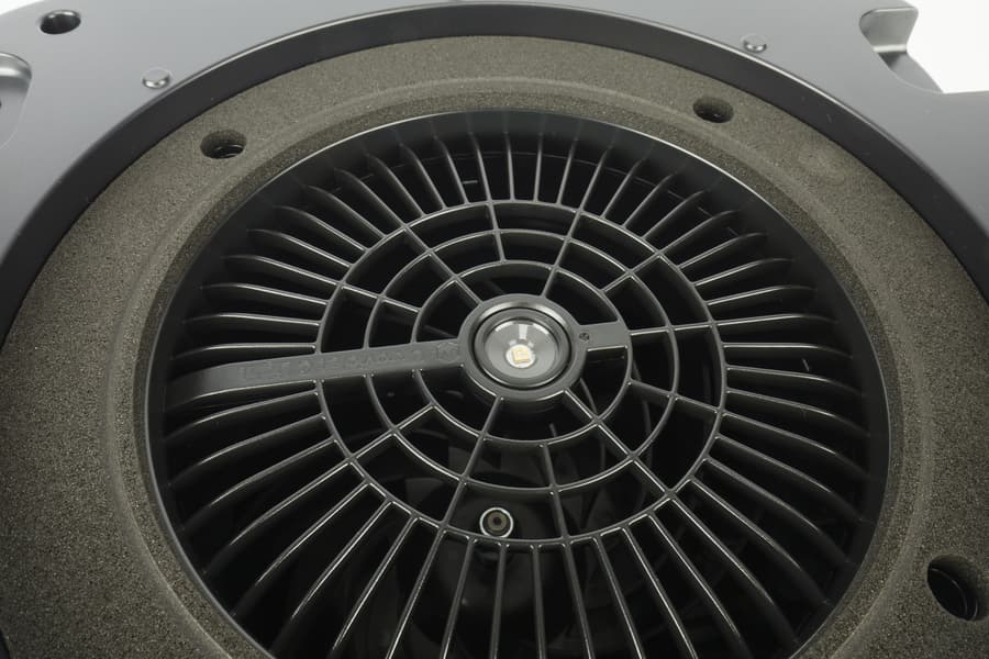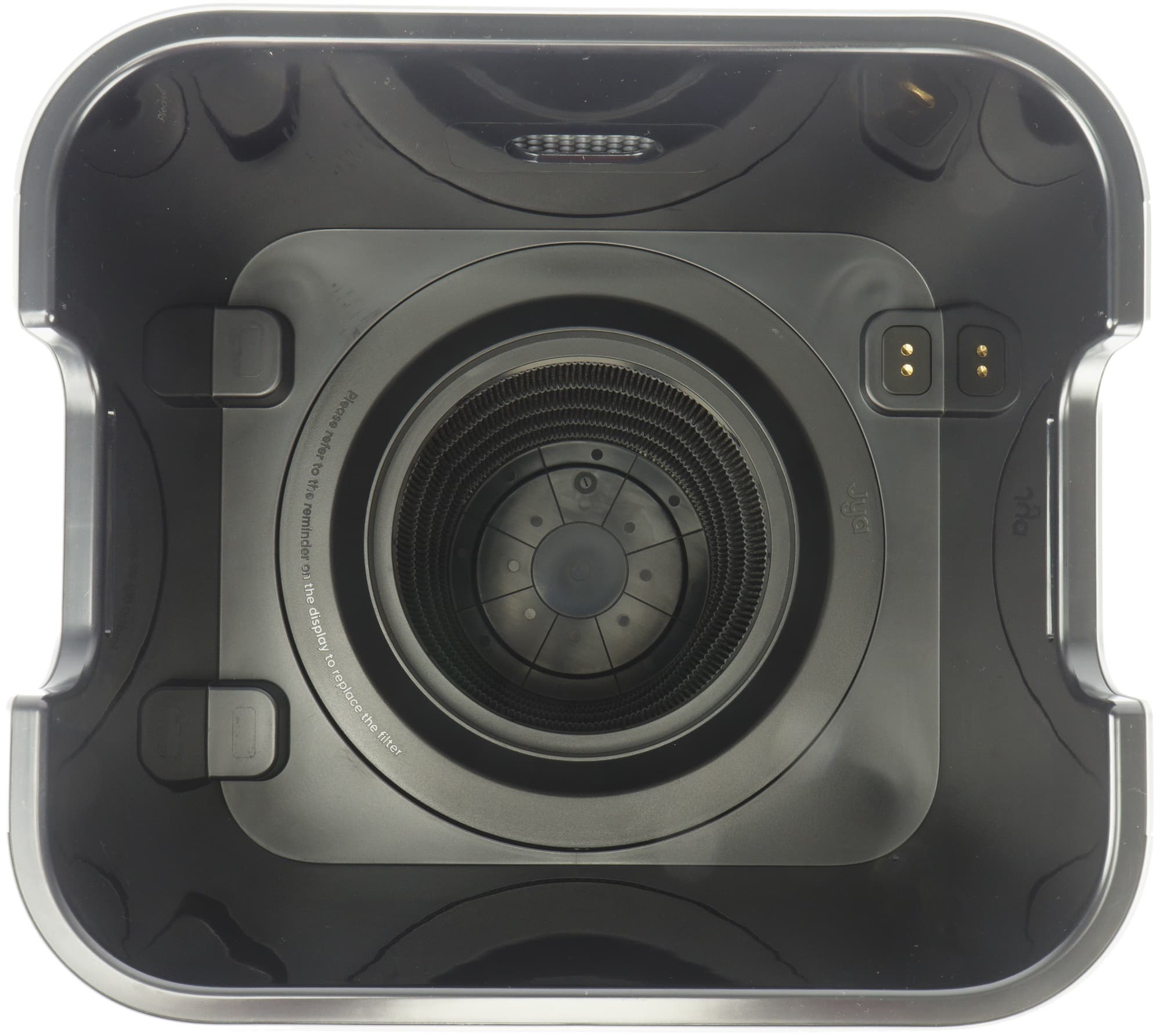 Основной же вентилятор скрыт под пластиковой решеткой снизу моторного блока. Она обрамлена пористым материалом, уплотняющим соединение с цилиндрическим фильтром. А в центре — УФ-светодиод, предназначенный для обеззараживания потока проходящего воздуха и внутреннего пространства фильтра.