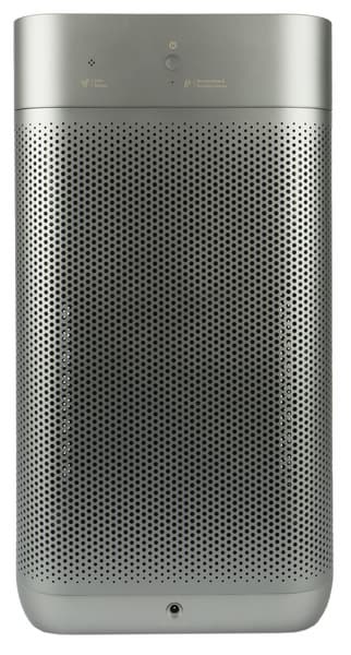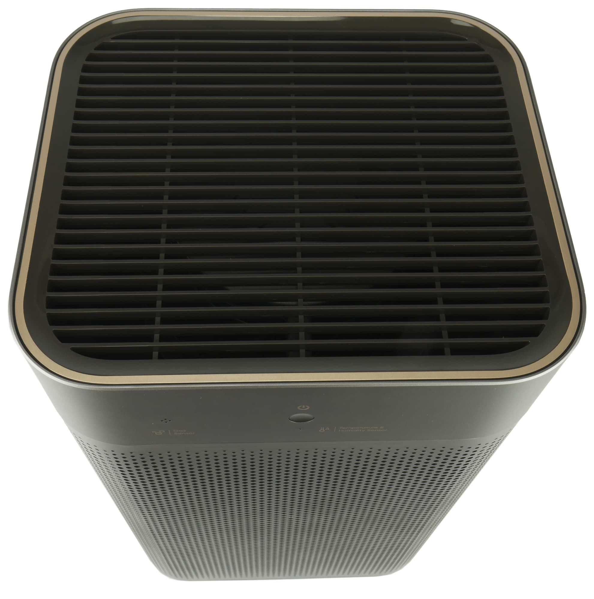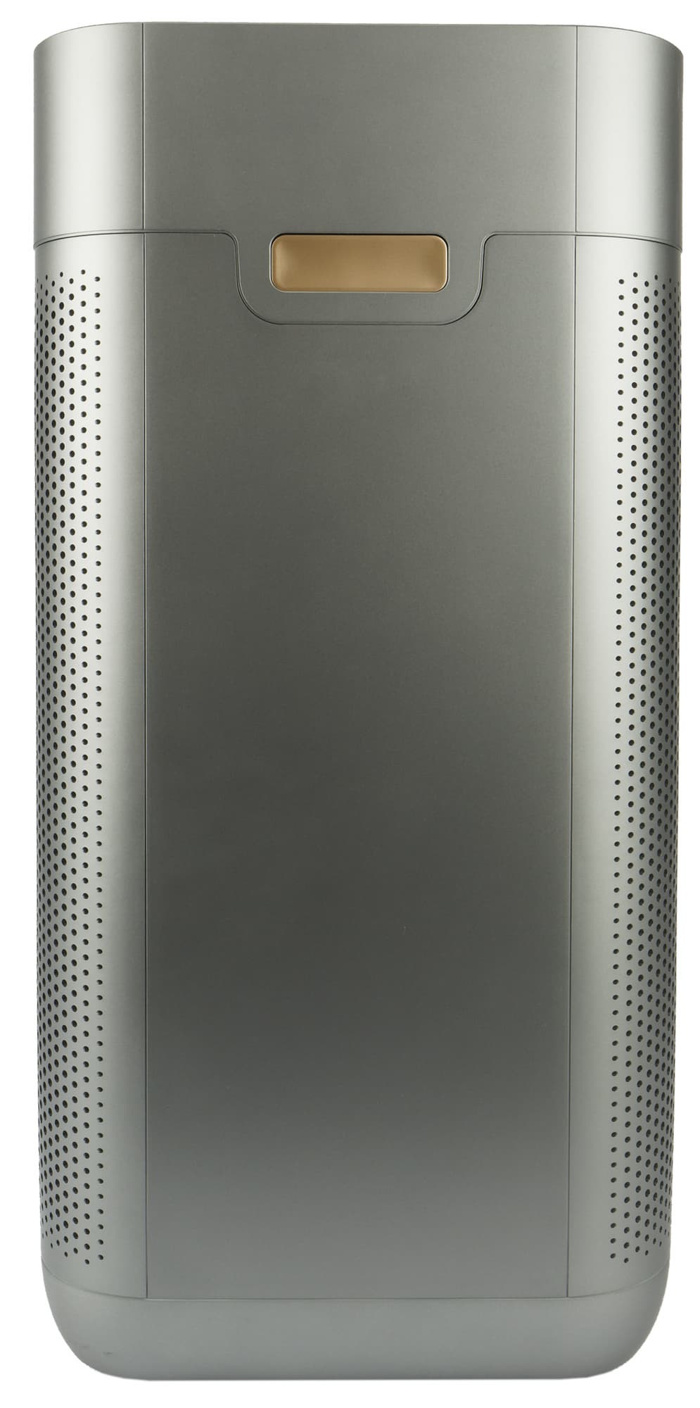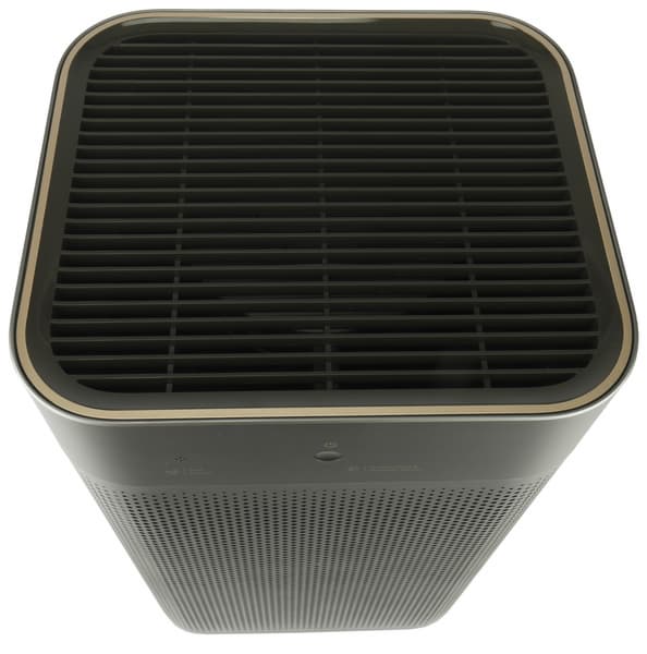 Всю переднюю стенку занимает воздухозаборная решетка из множества мелких отверстий. В правом верхнем углу расположен небольшой круглый сенсорный дисплей из черного пластика, а слева — золотистый логотип производителя.