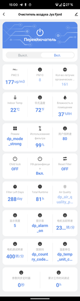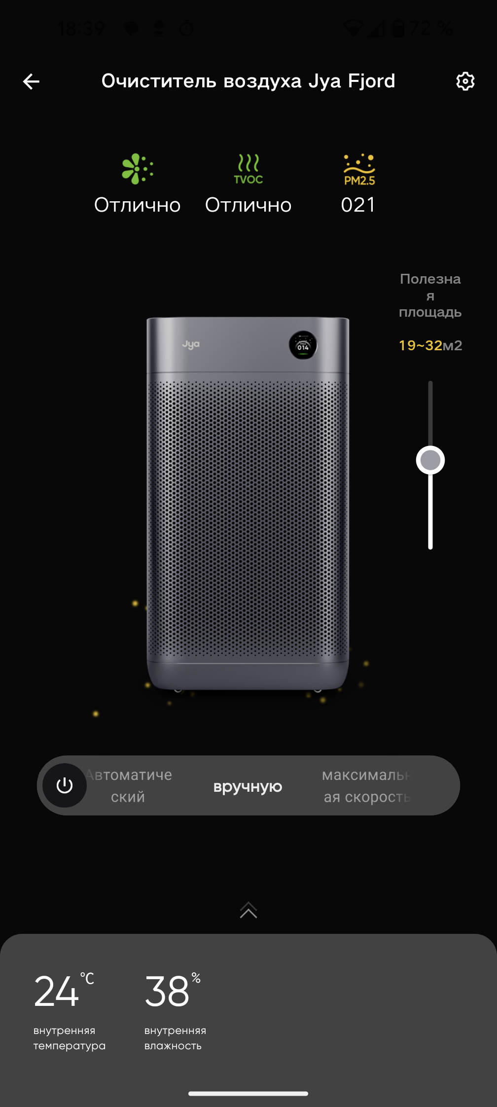 На главном экране приложения мы видим основные показатели качества воздуха (PM2.5, PM10 и TVOC), температуру и влажность. Слайдер под изображением воздухоочистителя позволяет изменить режим работы или выключить прибор.