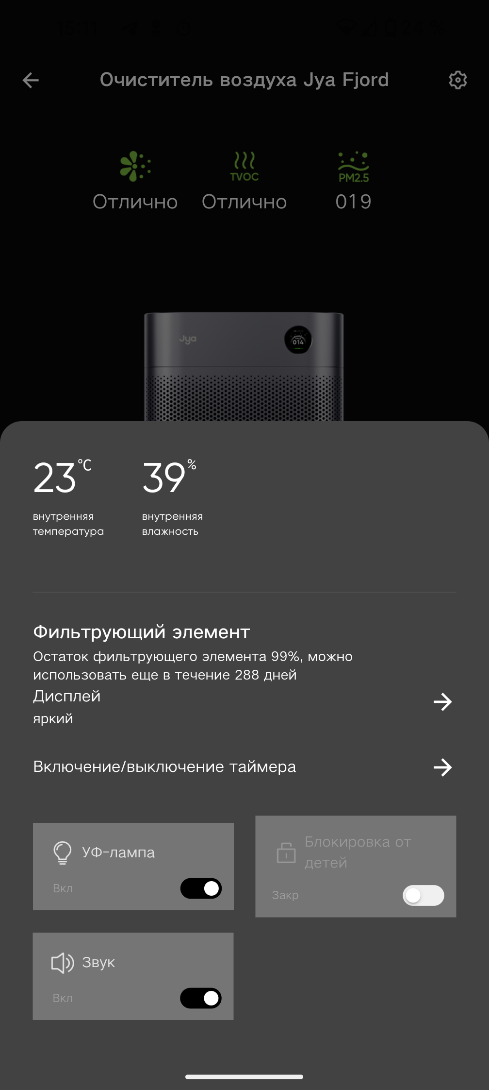 Потянув вверх шторку из нижней части экрана, мы видим чуть больше возможностей: здесь можно узнать ресурс фильтра, включить или выключить звук, УФ-лампу и режим блокировки от детей.