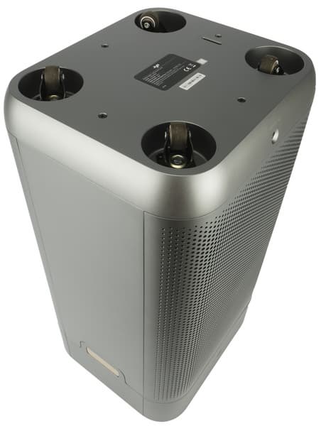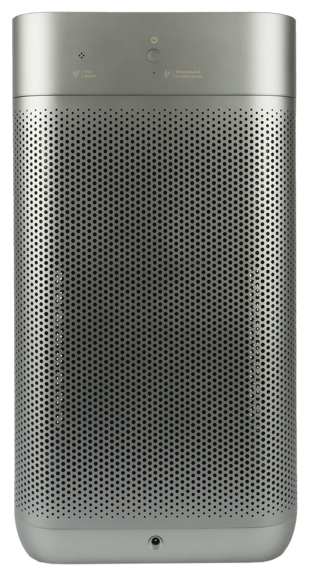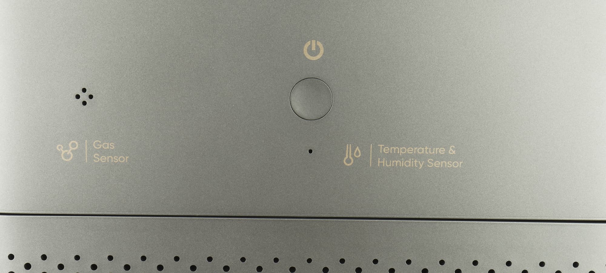 На задней панели мы видим такую же впускную решетку, как и спереди. Над ней расположена неприметная кнопка включения. Рядом с ней — два отверстия, под которыми скрыты датчики температуры/влажности и летучих органических веществ (TVOC). В нижней части — разъем питания.