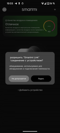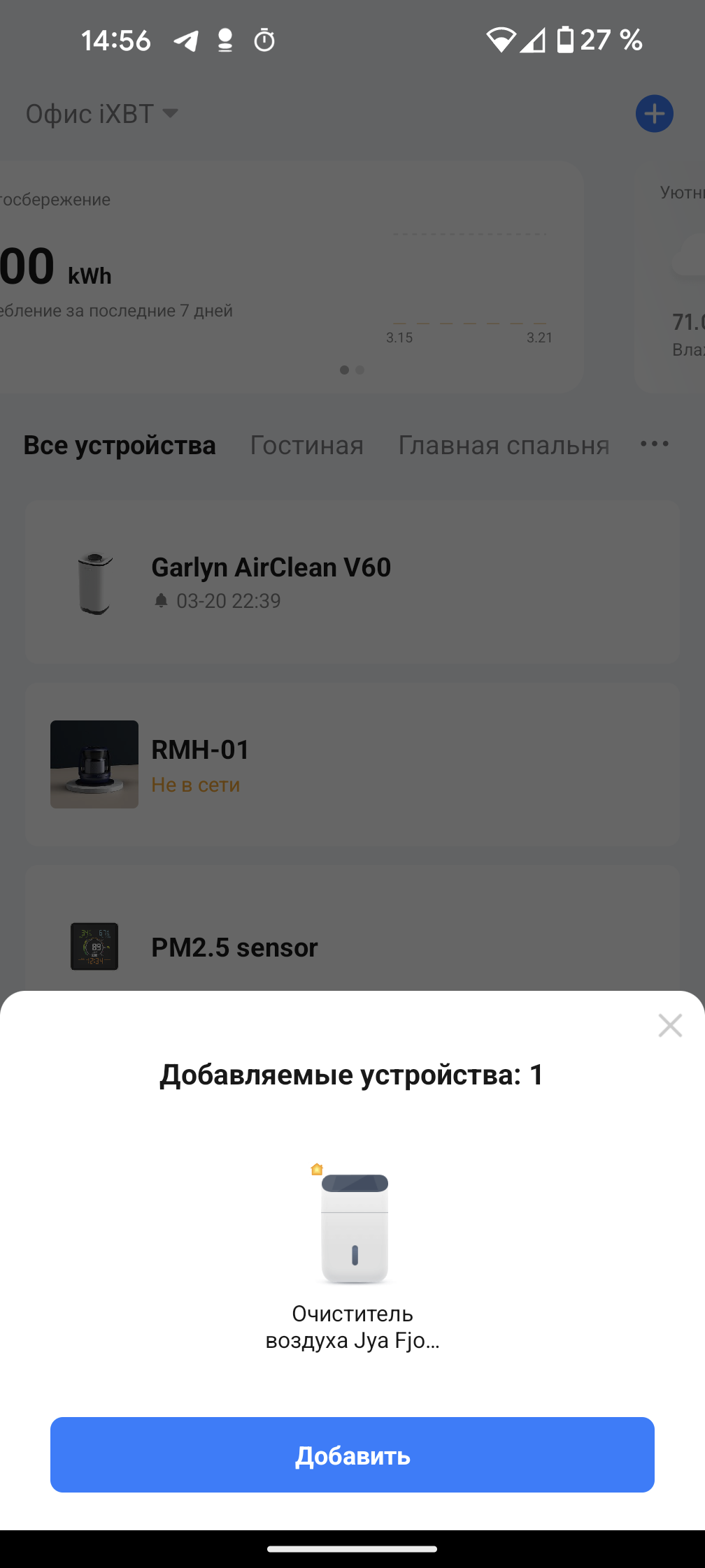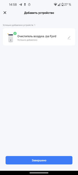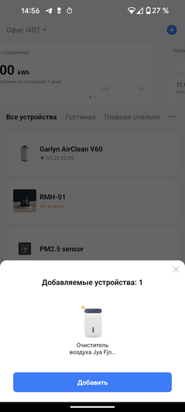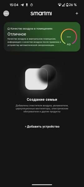 После включения воздухоочистителя в розетку он автоматически переходит в режим готовности к подключению. Хотя на панели управления и предусмотрен принудительный перевод устройства в режим сопряжения, делать это нам не пришлось: после нажатия на кнопку «Добавить устройство» на главном экране Smart Life появляется изображение прибора и ссылкой «Добавить».