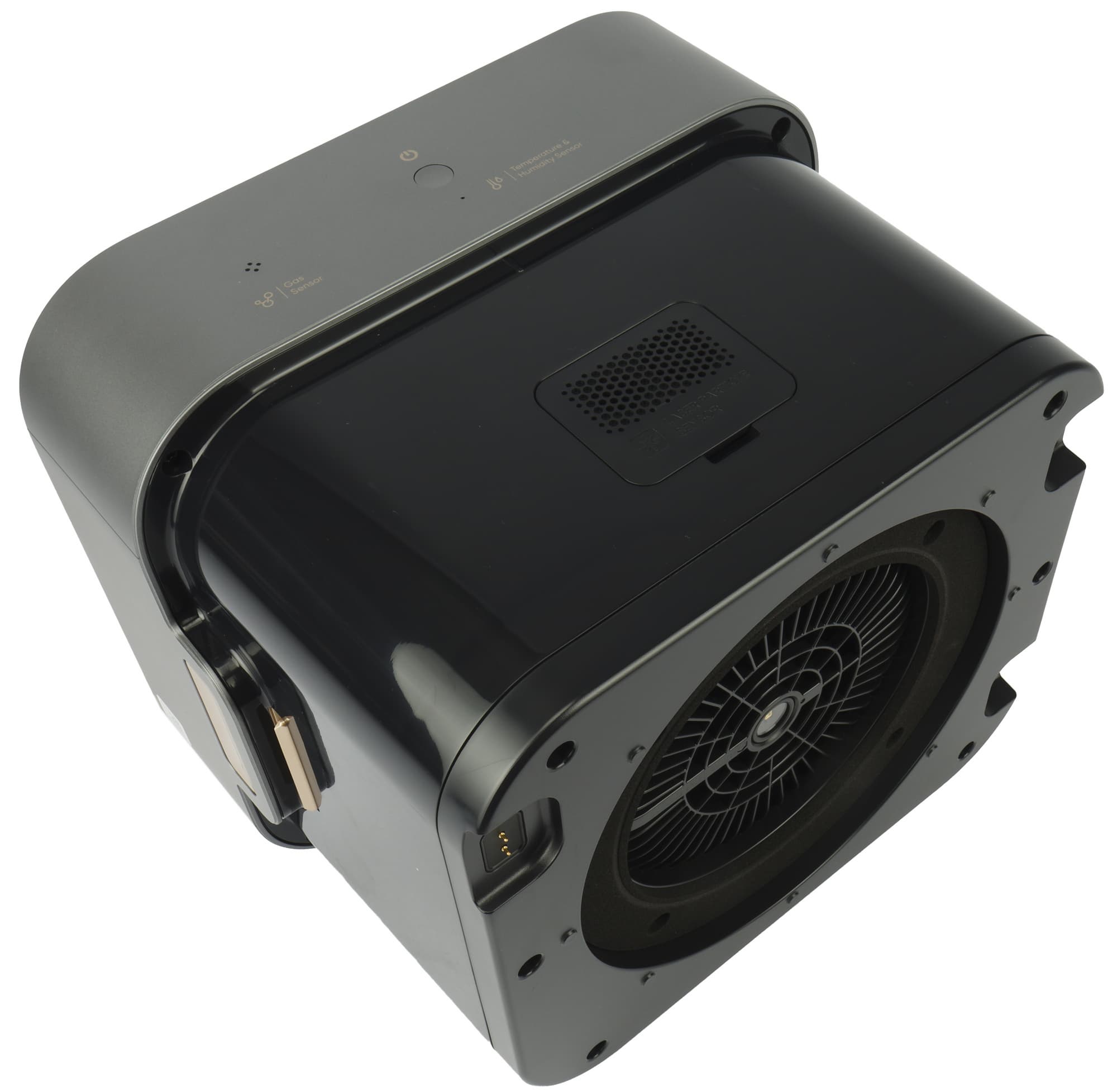 Корпус состоит из двух частей: сверху моторный блок с управляющей электроникой и вентилятором, а в нижней, значительно более объемной, — отсек с фильтром. Верхняя устанавливается на основание и закрепляется двумя защелками на боках.