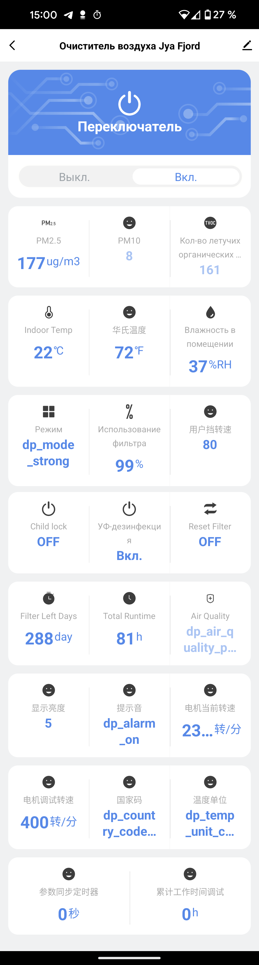 Главный экран устройства предоставляет доступ к большому количеству параметров — в том числе и недоступных из официального приложения от производителя. Часть из них осталась непереведенной с китайского, но переводчик Google легко справляется с этой проблемой.