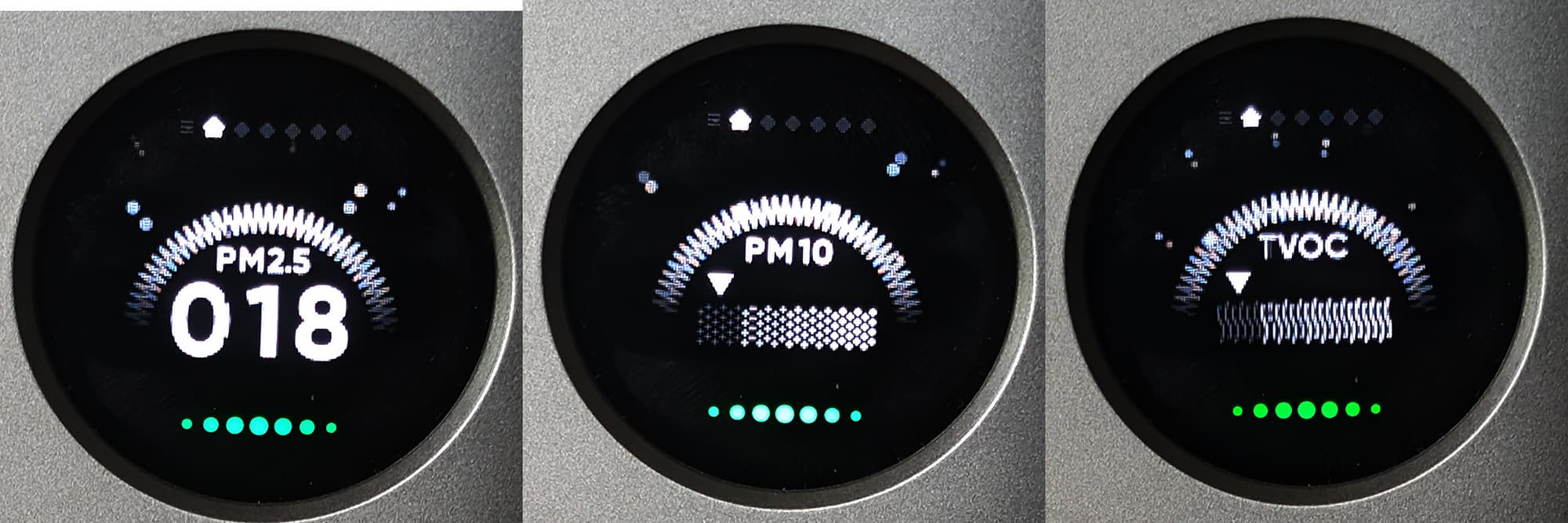 Небольшой сенсорный экран в верхнем правом углу передней панели попеременно выводит измеренные датчиками устройства значения PM2.5, PM10 и TVOC. Полоска под цифрами меняет цвет в зависимости от показаний: безопасному значению (1—20 мкг/м³) соответствует зеленый, хорошему (21—35 мкг/м³) — желтый, нормальному (36—55 мкг/м³) а опасному (свыше 55 мкг/м³) — красный.